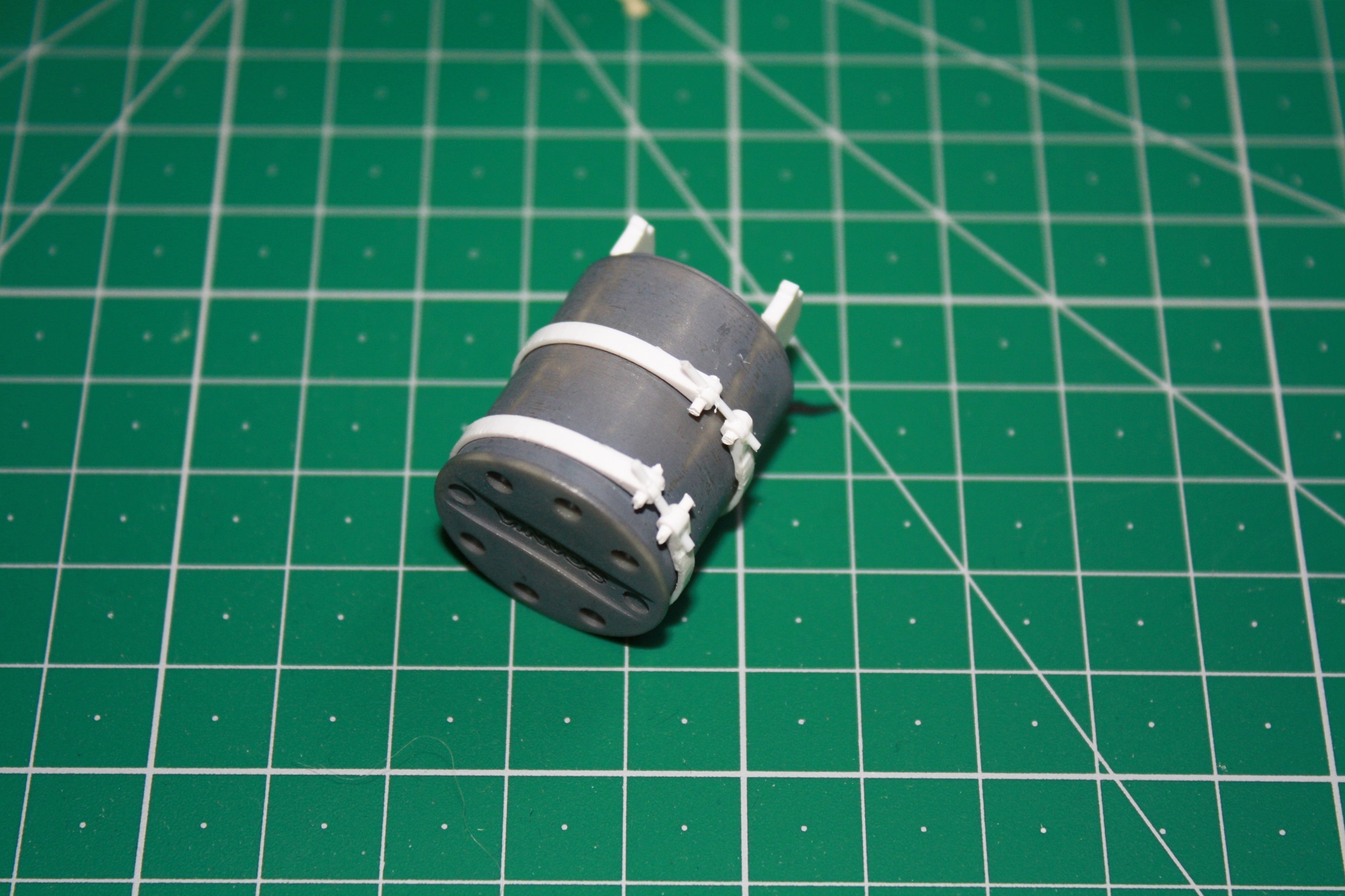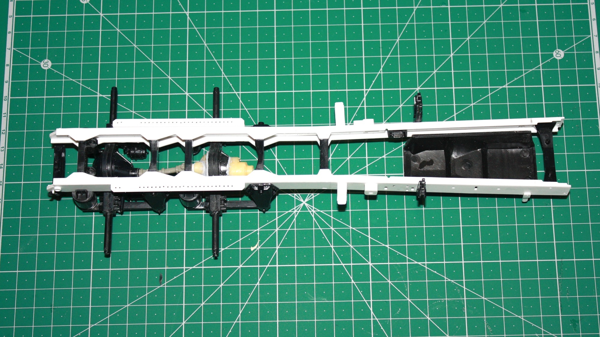 Hallo Modellbauer und Interessierte. Ich weiß, ich habe Eure Neugier sehr strapaziert. Für Euch hat es sicher den Anschein, dass es nicht weiter geht. Das kann ich schnell erklären. Ich bin mit dem Bau des Modells weiter, als es der Bericht und die Bilder zeigen. Das liegt aber daran, daß ich nicht so schnell mit dem Schreiben nachkomme. Beim BS. 23 solltet ihr alle Teile sauber entgraten und trocken anpassen. Beim Anbringen der Bohrungen müsst Ihr darauf achten, dass sie an der richtigen Stelle sind. Dazu einfach mal den Adblue - Tank zur Probe in die Halterung einlegen. Beim BS. 24 hatte ich ein kleines Problem. Die Spannringe für den Abgasfilter sind ein wenig zu lang. Zwischen dem Filter und den Spannringen ist ein Spalt und der Filter lässt sich nicht richtig befestigen. Das liegt, so denke ich, an der Toleranz der Maße während der Herstellung der Bauteile (Resinteile schrumpfen ein wenig beim aushärten). Einfach einiges abfeilen ist nicht möglich, da dabei die Halterungen für die Spannschrauben zu schwach würden. So habe ich das Spannband auf der kürzeren Seite gleich nach der Halterung für die Spannschraube abgetrennt, beide Teile ein wenig konisch gefeilt und mit Sekundenkleber wieder zusammengefügt. Dabei habe ich immer wieder kontrolliert, ob alles passt. Das Spannband sollte dabei so weit gekürzt werden, das bei eingelegtem Abgasfilter und eng anliegendem Spannband zwischen den Halterungen für die Spannschrauben etwa 1-2 mm Platz ist. Ich denke aber, dass das kein großes Problem ist. Wer sich das nicht zutraut, sollte zwischen den Abgasfilter und dem Spannband einen schmalen Streifen Evergreen legen. Da ich den Motor noch nicht eingesetzt habe, kann ich die Baustufe 25 und 26 auch noch nicht beenden. So habe ich, wie in BS. 25 beschrieben, das Auspuffrohr getrennt, aber noch nicht wieder zusammengeklebt. Ich habe in beide Teile je ein 1mm Loch gebohrt und auf einer Seite einen 0,9mm Draht eingeklebt. So kann ich bei der Montage die Teile gut zusammensetzen. In der BS. 26 wird der Luftfilter montiert. Bei den BS. 27 und 28 solltet ihr immer wieder die Passgenauigkeit prüfen und gegebenenfalls das Ganze anpassen. Das alles geht aber ohne große Probleme. In der BS. 28 habe ich das Evergreen durch 2,2 mm² starken Kupferdraht ersetzt. Diesen Draht erhalte ich aus einem 2,5mm² - Elektrokabel, welche ich als Reststücke vom Elektriker bekommen habe. Der Draht passt genau in die Bohrungen im Rahmen und ist stabiler. In der BS. 29 werden nun der Rahmen und die Schutzbleche zusammengefügt. Jetzt habe ich einen Fehler gemacht und trotz mehrmaligem Nachmessen die Kardanwelle zu kurz abgeschnitten. Also habe ich ein Stück wieder angeklebt. Damit es einen besseren Halt hat, ist es mit Draht gestiftet. Weiter geht es mit der BS. 31- 36. Dazu mehr im nächsten Teil.