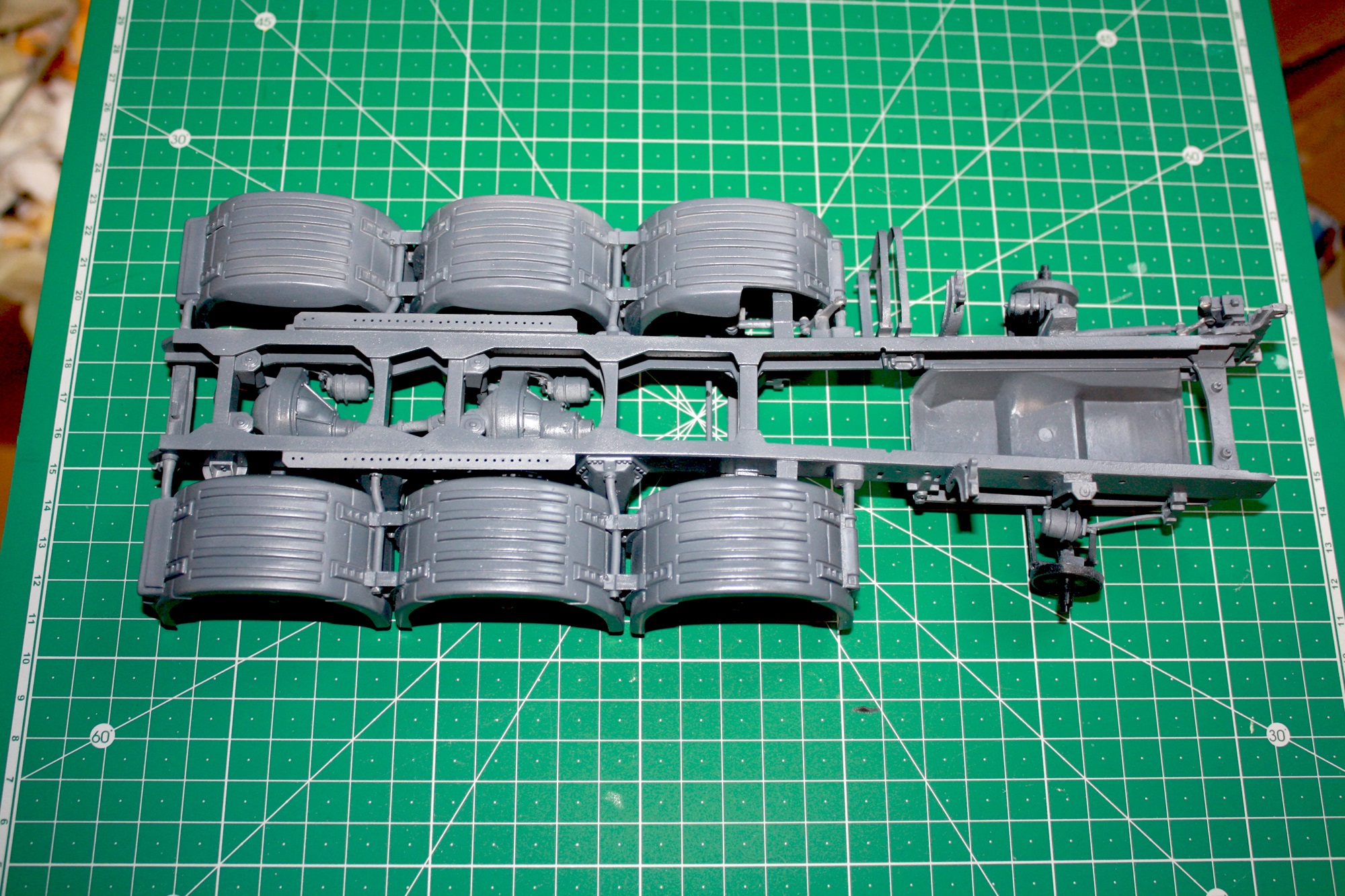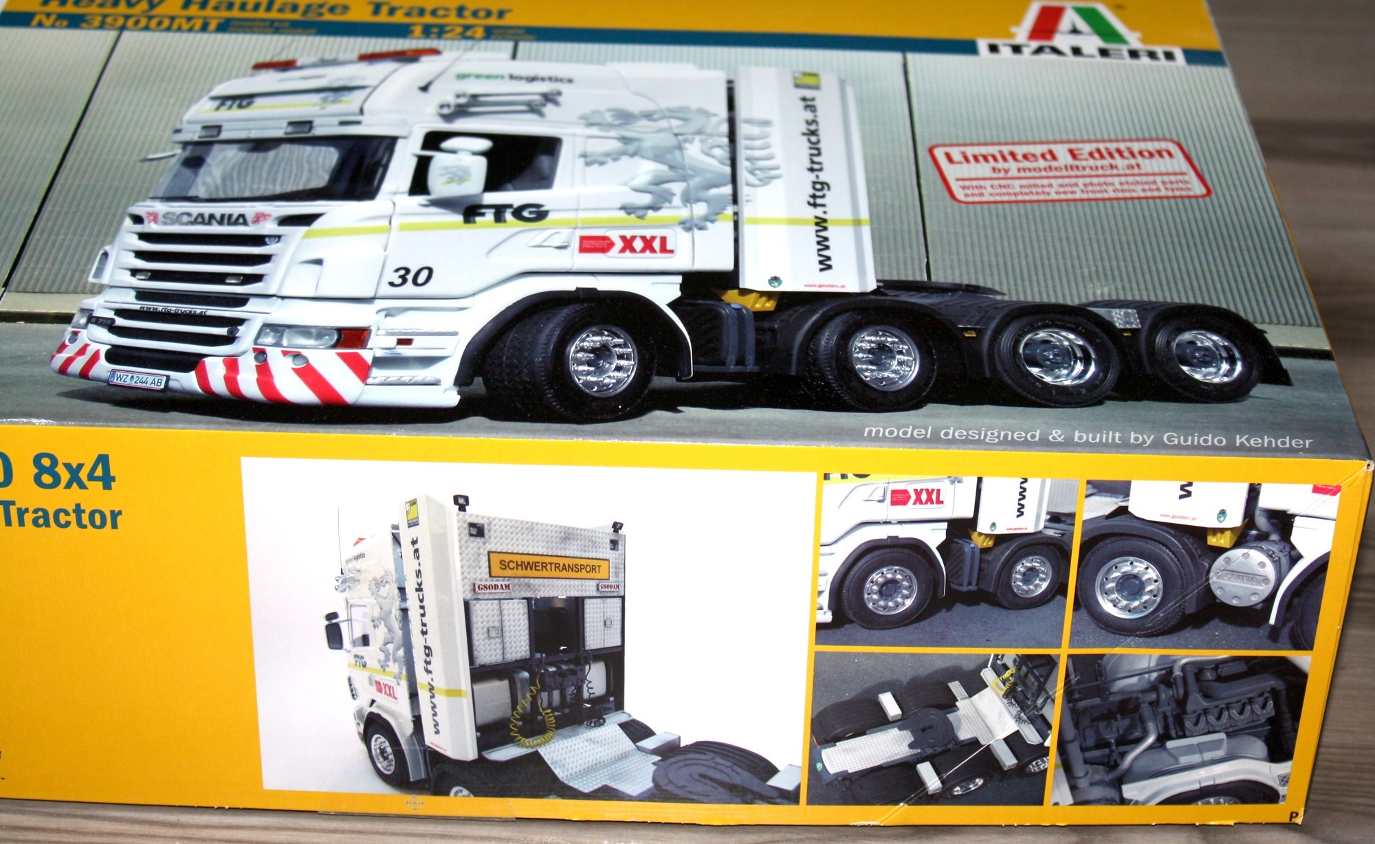 Baubericht Scania R 730 8X4 Bausatz Exklusiv vom Model Maker Shop office@modelmaker-shop.com Nr.3900MT Ich möchte euch am Bau der Schwerlastzugmaschine Scania R 730 8X4 in Wort und Bild teilhaben lassen. Der Bausatz ist ein Komplettbausatz. Das bedeutet für euch, es sind alle Teile zum Bau des Modells im Bausatz enthalten. Das wird kein Baubericht wie ihr ihn aus den Foren kennt. Das ist nicht so mein Ding. Ich möchte euch hier meine Art und Weiße aufzeigen, wie ich einen solchen Bausatz baue. Ich gehe nach der Bauanleitung - Schritt für Schritt vor. Ja; ich baue mir Baugruppen zusammen, welche ich dann farblich grundiere, um sie dann weiterbearbeiten zu können. Nun aber zum Bausatz! Wenn ihr den großen Karton öffnet, seht ihr eine große Anzahl von Spritzlingen, CNC gefrästen Teilen, Resin- und Ätzteilen. Desweiteren ist in der sehr guten Bauanleitung ein Vorwort sowie eine Packliste und ein umfangreicher Decalbogen beigelegt. Ich verzichte hier in diesem Bericht darauf jedes einzelne Bausatzteil im Bild vorzustellen. Das ist in den bekannten Foren bereits gemacht worden. Als erstes: Lest euch das Begleitschreiben gründlich durch. Das ist wichtig, denn die unterschiedlichen Materialien erfordern auch verschiedene Bearbeitungsmethoden. Ich habe mein Werkzeug bereitgelegt. Der Bau kann beginnen. Die gefrästen Rahmenteile werden herausgetrennt, kleine Grade entfernt. Achtung! Nicht die kleinen Kanten im hinteren Bereich an den Teilen 1 M und 4 M entfernen! Für das Teil 3 M das zusätzlich beigelegte Teil verwenden! Die Teile anschließend auf einer ebenen Unterlage rechtwinklig verkleben. Bei dem Bauschritt 2 sind die Teilenummern vertauscht! ( rechts und links ) Ich folge den weiteren Baustufen der Bauanleitung und komplettiere den Rahmen. Eigentlich war meine Vorstellung, den Bausatz aus der Box zu bauen! Wie ihr auf dem Bild sehen könnt, weiche ich aber ein wenig davon ab. Ich habe mir für ein früheres Scaniaprojekt Achsen mit einem Durchtrieb gemacht. (2 angetriebene Hinterachsen) Da ich davon noch die Abgüsse habe, wurden diese auch hierfür verwendet. Die Baustufe 11 lasse ich erst einmal aus, da der Motor noch farblich gestaltet wird.