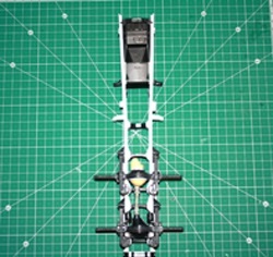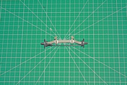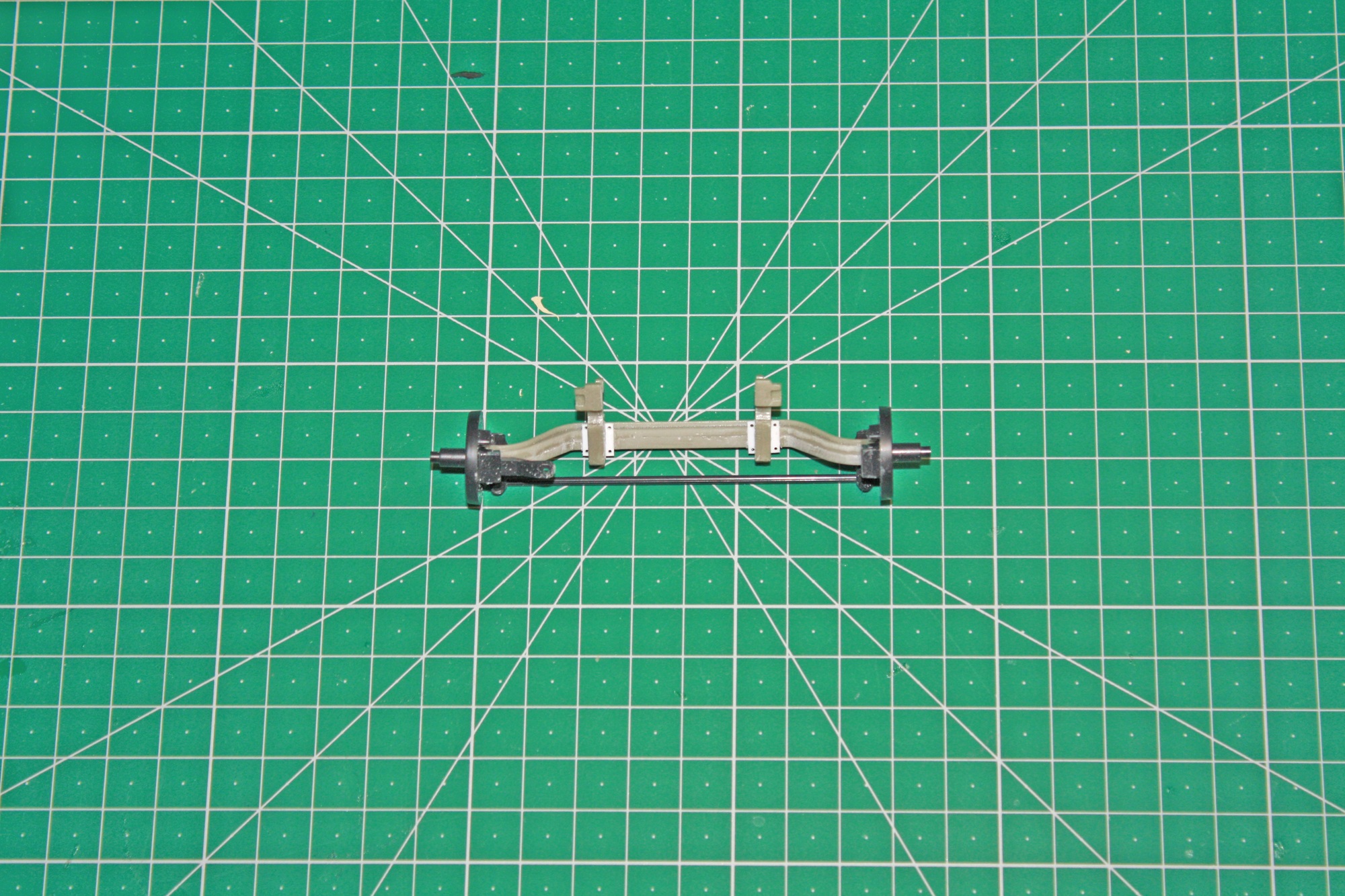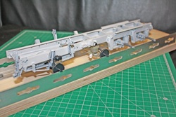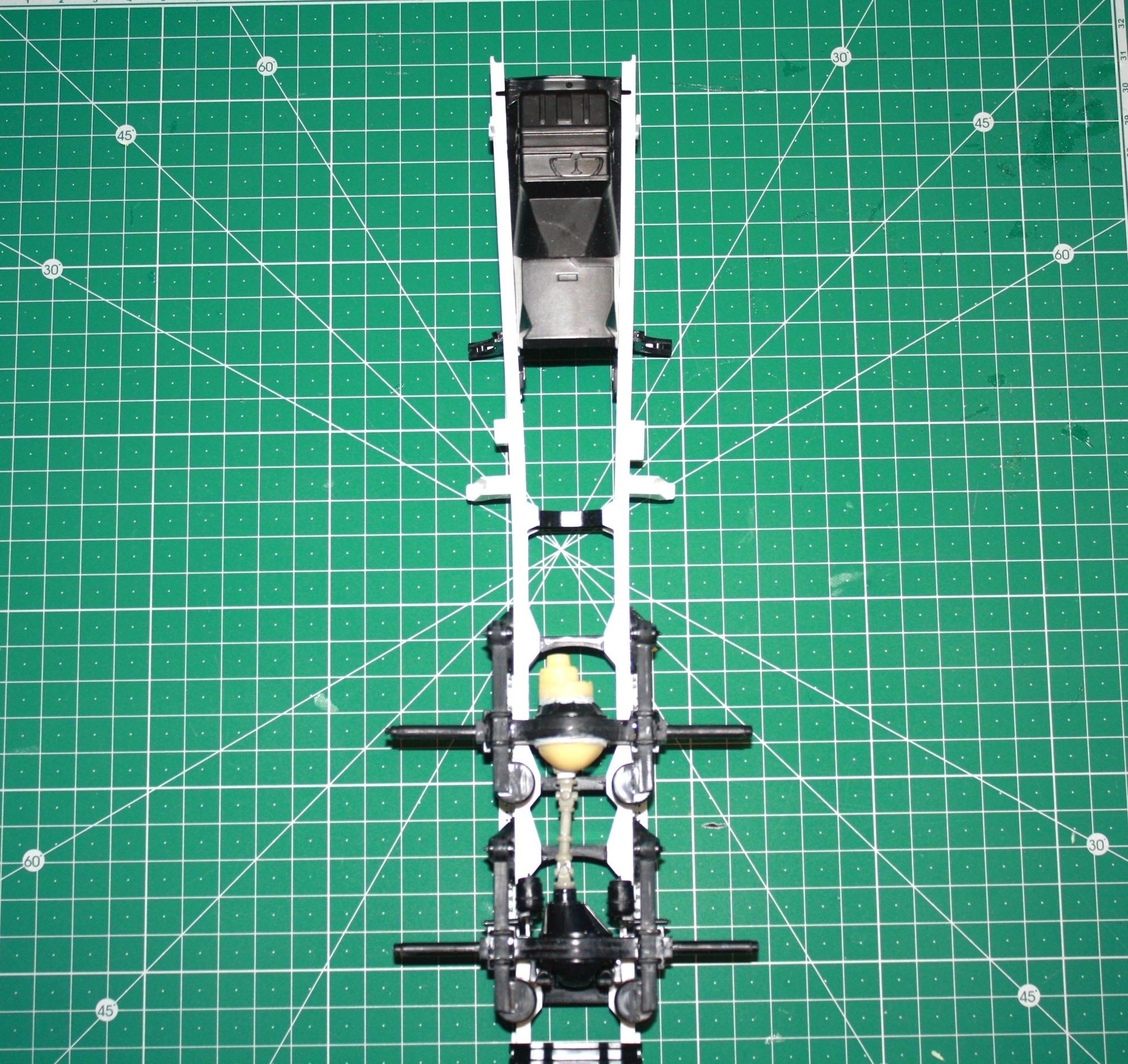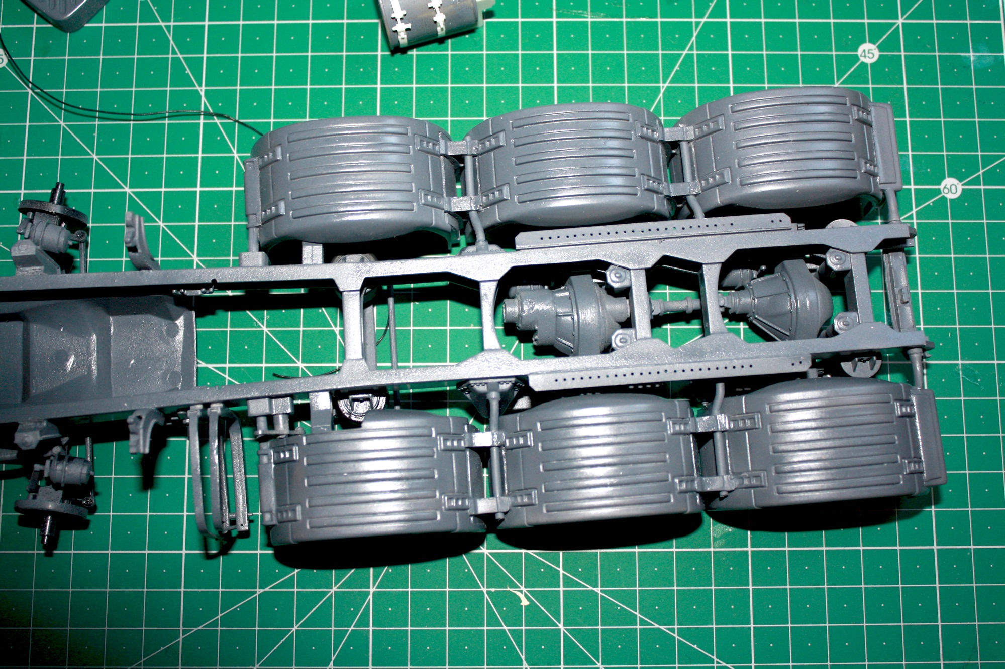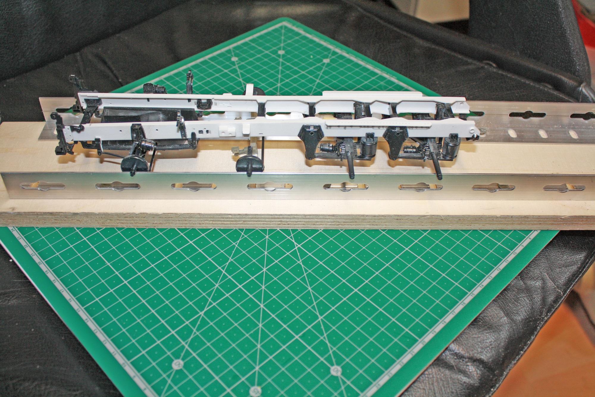 Ein Tipp im Allgemeinen. Um mir zu merken, welchen Bauschritt ich abgeschlossen habe oder welcher noch nicht fertig ist, mache ich mir in der Bauanleitung Markierungen. Ist es ein Bauvorhaben für das ich keine Bauanleitung habe oder ist es ein kompletter Eigenbau, so mache ich mir Notizen darüber, was noch zu beachten und zu bearbeiten ist. Beim Bau meines Modells bin ich einige Baustufen vorangekommen. So wird in der Baustufe 12 damit begonnen, die Lenkschubstangen auf die 2. Lenkachse anzupassen. Ihr solltet es genauso machen, wie es in der Anleitung angegeben ist. Im Weiteren wird die Vorderachse genau nach Plan gebaut, das Lenkgetriebe etwas angepasst und die Lenkschubstange zur 2. Lenkachse in der mitgelieferten Lehre gebogen und eingebaut. Im Bauschritt 16 solltet ihr einmal mehr als sonst die Teile vor dem Zusammenkleben anpassen. Das ist notwendig, weil hier verschiedene Materialien verwendet werden. Im Bild 7 seht ihr den Umbau der Lenkschubstange und im Bild 8 die 2. Lenkachse. Der Bau der Stufen 17-21 erfolgt nach Bauplan. Für diejenigen, die zum ersten Mal ein 4-achsiges Fahrzeug bauen: Die eigenartig aussehende Vorrichtung dient dazu, das später alle Räder den Boden berühren. Nach Plan geht es weiter bis zur Stufe 22. Wie auf dem Bild 10 zu sehen ist, habe ich den Rahmen bereits grundiert. So kann ich mögliche Baufehler besser sehen.