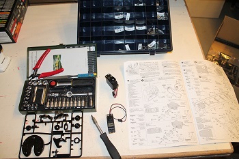 Die Bauanleitung ist sehr ausführlich und gut bebildert. Als Werkzeug benötige ich zunächst einen Seitenschneider um die Plasteteile aus den Rahmen auszuschneiden, eine Schlüsselfeile um die Schneidefläche sauber zu feilen und einen Nusskasten. Darin sind die vielen Kreuzschlitz- und Steckschlüsselaufsätze enthalten, die beim Zusammenbau benötigt werden.