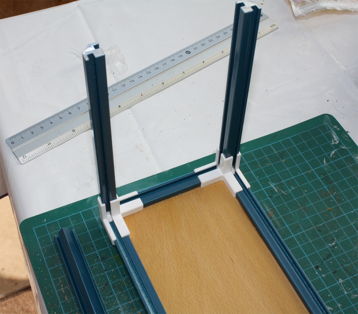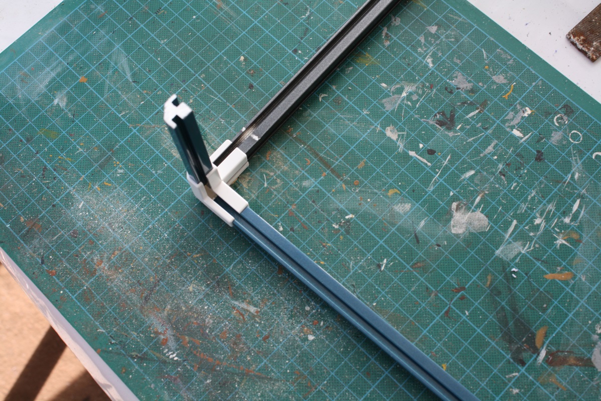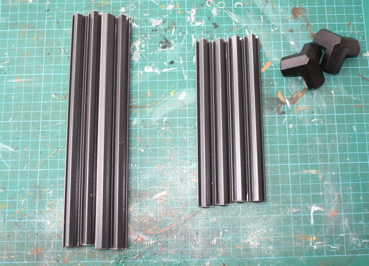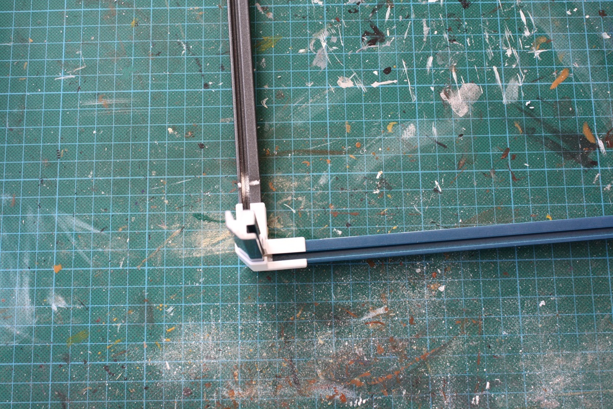 Das System besteht aus Aluminiumprofilen. Zum Set gehören auch die Eckverbinder und eine Glasscheiben.