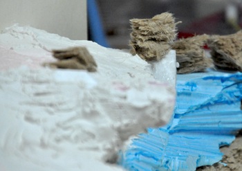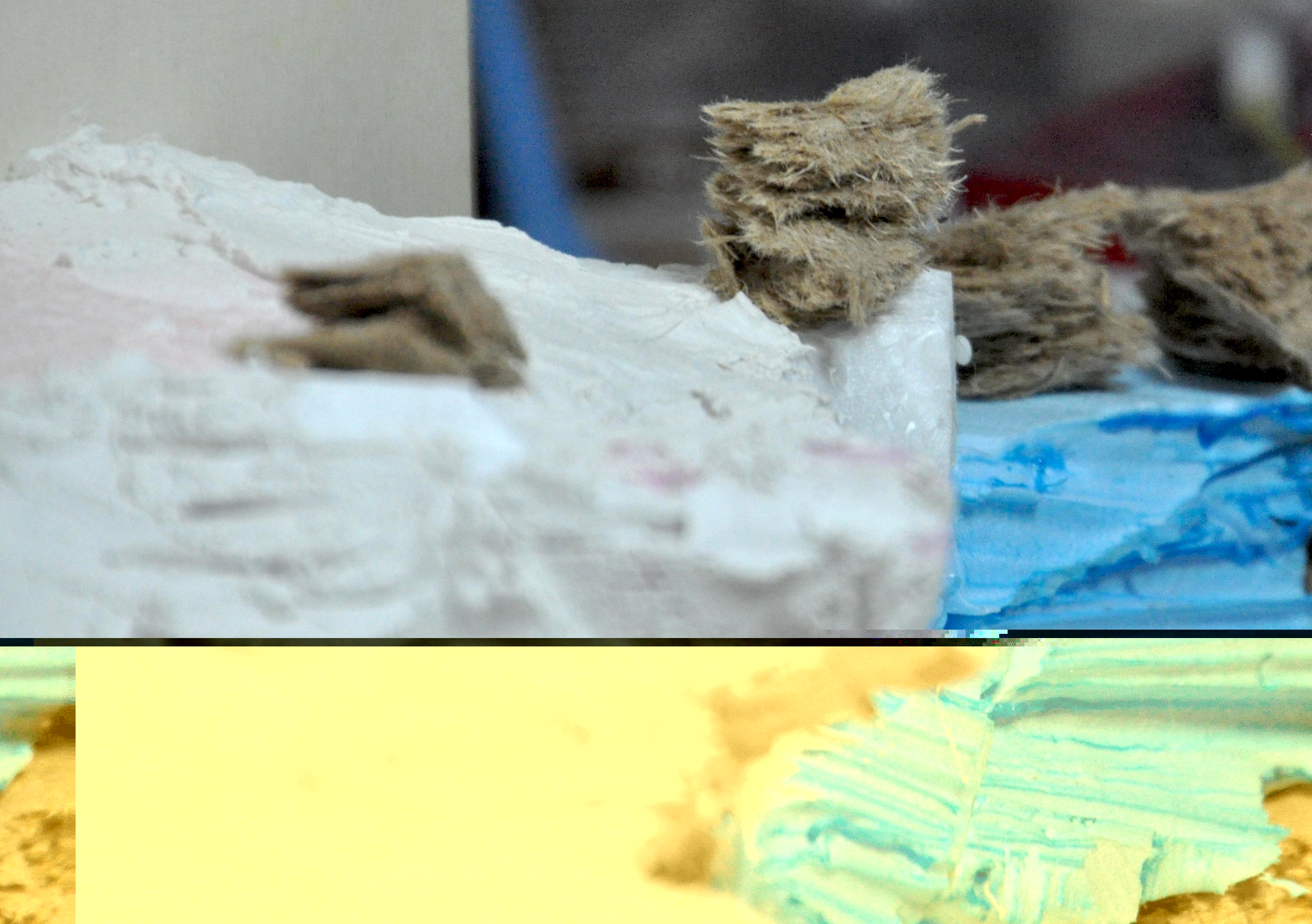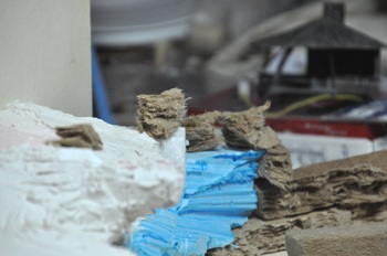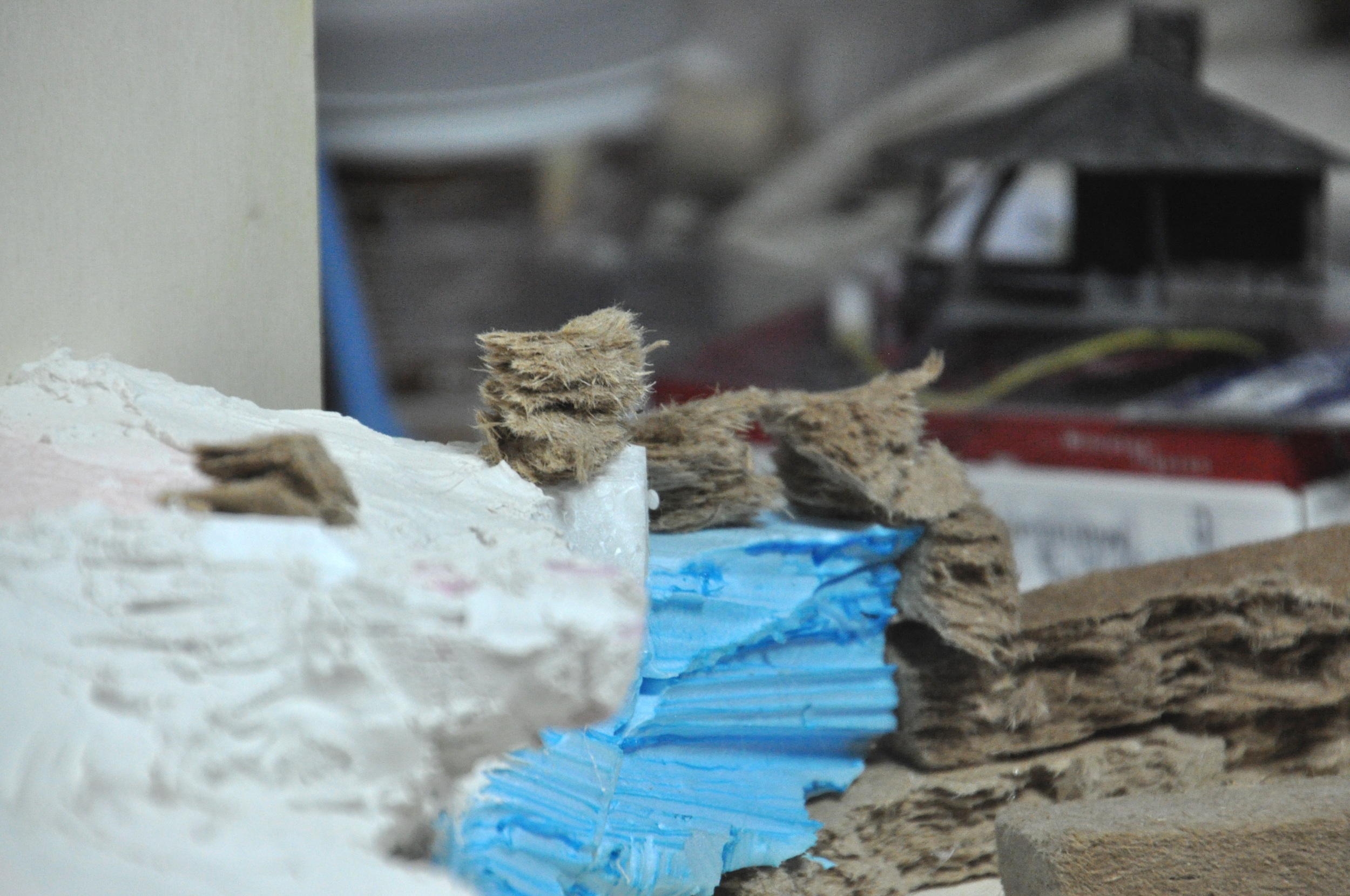 Die verwendeten Materialen sind weiches Dämmfasermaterial (Akustikausbau) , Styropor, Styrodur®, zum Modellieren