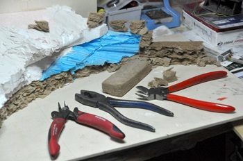 Dasselbe passiert mit Teilen aus Styrodur und Styropor. Sie verändern im fertigen Diorama die Felsstruktur, zum Bespiel durch Erdverschiebungen oder Gesteinsarten in andere Ebenen.