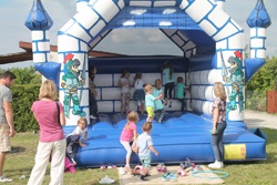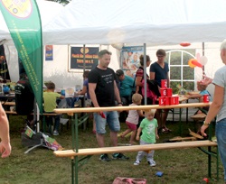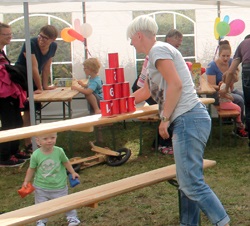 Auf der Hüpfburg vor dem Zelt wurde ordentlich herum getollt. Sportlich ging es auch beim Büchsenwerfen zu. Eine ruhige Hand hingegen brauchte man beim Stühle stapeln nötig. Bei wem die übereinander gestellten Stühle umfallen, der hat verloren.