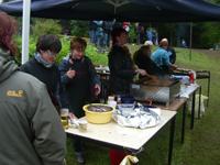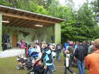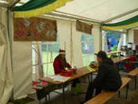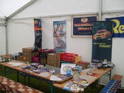 Da es draußen hochwasserbedingt recht feucht war, haben wir uns einen Platz im großen Zelt gesucht und unseren Stand aufgebaut.