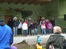 Dann kamen auch schon die ersten Cowboys und Indianer. Sie wurden mit einem Tanz nach Cowboymanier begrüßt.