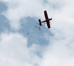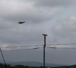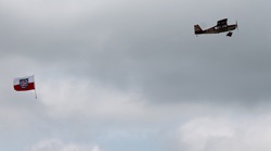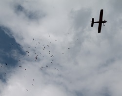 Mehrmals an diesem Tag stieg dieses ganz besondere Flugzeug in den Himmel. Während des überfluges über das Rollfeld öffnete der Bonbonbomber seine Ladeluke, sehr zur Freude aller anwesenden Kinder.