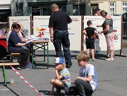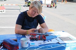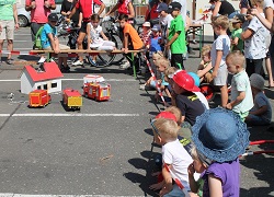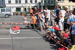 Die jungen Besucher hatten die Möglichkeit, bei einem Wissenstest das Wichtigste bei einem Notfall zu lernen, das richtige Verhalten oder die sieben W`s bei einem Notruf. Ich hatte Hilfe beim Bau einer Drehleiter mit Rettungskorb DLK 23-12 aus Pappe und neben mir löschte Maik König mit seinen RC-Feuerwehrfahrzeugen einen Häuserbrand.