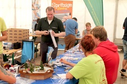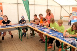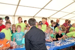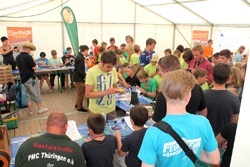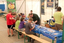 Der Leiter der Geschäftsstelle des Landesverbandes der Thüringer Feuerwehr, Herr Münch, ist beim Kinderkult in Erfurt an uns herangetreten. Dort hatten wir ja mit den vielen Kindern u.a. den Balsaholzflieger von Revell gebaut und sind problemlos mit der großen Anzahl der Besucher zurecht gekommen. Das hat ihn so sehr gefallen, dass er uns fragte, ob wir das nicht noch einmal machen würden und in das alljährlich stattfindende Zeltlager der Jugendfeuerwehr kommen könnten. Unsere Aktivitäten bei der Freiwilligen Jugendfeuerwehr in Arnstadt sind schon eine große Sache, aber das hier war dann doch noch eine Nummer größer, wie man auf den Fotos sieht. Gleich beim Kinderkult habe ich mich mit Ullrich Taubert zusammen gesetzt und die Möglichkeiten der Unterstützung von Revell abgesprochen. Vom Ulli hatte ich das O.K. bekommen und so bin ich also am Sonntag ins Sportforum gefahren. Mit dabei waren Christian Voss und Jean-Luc Böhm vom PMC Thüringen und mein Bastelfreund Marc. Diese Mithilfe war aber auch bitter nötig.