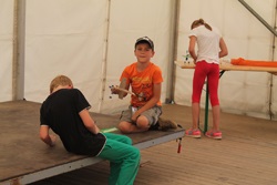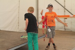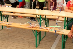 Unser Bastelstand war im großen Hauptzelt des Lagers eingerichtet. Gleich davor wurden die eben gefertigten Gleiter mit und ohne Propeller, so zusagen, auf Herz und Nieren getestet und in einer Meisterschaft: `Welcher Flieger fliegt am weitesten` den ganzen Tag lang ausprobiert.