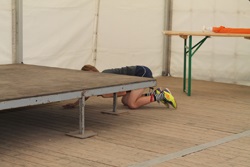 Im Zelt waren natürlich die besseren Witterungsbedienungen, was den Modellflug betrifft, aber es kann dann schon mal passieren, dass ein Balsaholzflieger unter die Show-Bühne geflogen ist.