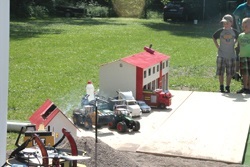 Bei den RC-Freunden vom MAC Arnstadt musste die Feuerwehr sogar wieder zu einem Häuserbrand ausrücken. Dazu fuhren die Fahrzeuge aus der im Modell nachgebildeten Feuerwache zur Brandstelle. Wegen des sehr warmen Wetters wurde das Wasser auch mal anderweitig versprüht, was auch sehr gut ankam.