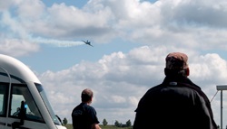 und allzu weit mussten die Besucher gar nicht in die Ferne schauen. Der Hubschrauber zum Beispiel kam ganz dicht an den Leuten vorbei. Natürlich waren die Flugzeuge und die Leute durch das Sicherungsnetz getrennt.