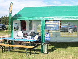 Dann endlich hebt sie ab. Das inzwischen 27 Jahre alte Flugzeug hat das vereinseigene Banner im Schlepp und somit werden alle Piloten, die an der Modellflugshow teilnehmen auf das Herzlichste begrüßt. Gleichzeitig signalisiert das den Startschuß für die Veranstaltung und ist weithin in der Umgebung sichtbar.