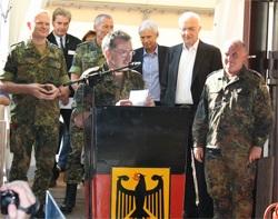 Gemeinsam eröffneten Oberstleutnant Kay Schuhmacher, der Kommandeur des Panzerpionierbataillon 1, Oberstabsfeldwebel Helmut Duntemann, Fritz Pleitgen, Präsident der Deutschen Krebshilfe e.V. und Divisionskommandeur Generalmajor Carsten Jacobson am Samstagmorgen die Veranstaltung.