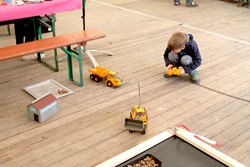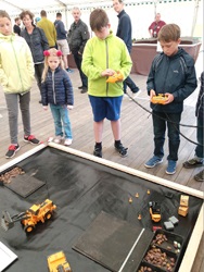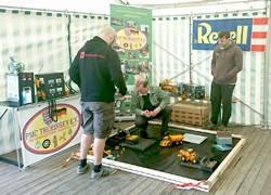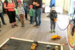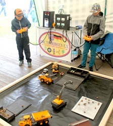 Die Fahrzeuge werden analog ferngesteuert. Deswegen sollte normalerweise immer nur eine Maschine gesteuert werden. Aber wenn mal sehr viele Besucher ihr Talent an den Fernbedienungen ausprobieren wollten, konnte ich mittels meinem RFID-Chip alle Maschinen gleichzeitig zuschalten. Dann war auf der Baustelle richtig viel Fahrverkehr zu erleben. Für 5 Minuten Fahren mit den Baumaschinen haben wir 1€ eingenommen und so kamen dann insgesamt 145€ für die Stiftung Deutsche Kinderkrebshilfe zusammen.
