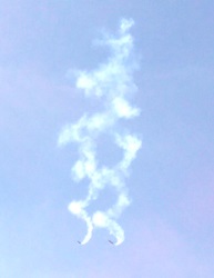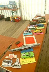 Draussen vor dem Zelt flogen dann auch, wir sind ja schließlich auf einem Flugplatz, die kleinen und etwas größeren Flugzeuge. Die Piloten der Düsen-Jets zeigten ihr Können an den Fernbedienungen, in dem sie mit Rauch Bilder an den Himmel malten. Und das rote französische Flugzeug hatten wir mal vor ein paar Jahren als Bastelmodell bei uns an der Bastelstrasse.