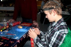 Das Licht wurde reduziert, damit die Beleuchtung, die in den ausgestellten Exponaten eingebaut war, besonders gut zur Geltung kam. Das sah zwar gut aus, hatte aber auch zur Folge, dass wir nur noch unter erschwerten Bedingungen weiter basteln konnten. Das hat uns aber auch nicht weiter gestört. Schnell wurde die Stirnlampe aufgesetzt und weiter ging es. Spaß muss sein.
