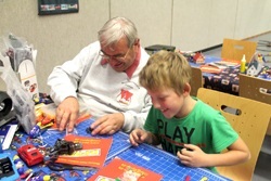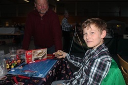 Am Abend konnte ich dann noch ein bekanntes Gesicht an unserer Bastelstrasse begrüßen. Dieser junge Mann war schon voriges Jahr da und hatte damals einen ADAC-Hubschrauber gebastelt. In diesem Jahr haben es Ihm die Autos angetan, zuerst den roten Pajero und dann wurde gemeinsam mit Bruno das kleine Herpa-Auto zusammen gebaut. Zum Schluss wurde dann alles in die Tragetasche zum Tag des Modellbaus getan. Eine gute Idee, wie ich finde. Da geht auf dem Heimweg nichts kaputt und ein bisschen Werbung für den Modellbau wird auch gleich mit gemacht.