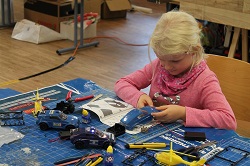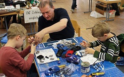 Wie schon oben geschrieben, gestalte ich in Philippsthal in diesem Jahr unseren Beitrag zum Tag des Modellbaus. Dank der zahlreichen Modelle, die ich und all die anderen Vereine dazu von den Firmen Faller, Revell, Airfix, Heller &. Glob2b bekommen habe, können wir vielen Kindern ein stolzes Lächeln ins Gesicht zaubern. Wobei die Kinder die Modelle, zumindest bei mir, selber bauen müssen. Ich zeige zunächst den Teilnehmern, wie die Bauanleitung zu lesen und das Werkzeug zu benutzen ist. Dann beschränkt sich meine Arbeit darauf, auf Fehler hinzuweisen und zu korrigieren, oder auch sonst mal helfend einzugreifen. Ein weiteres kleines Highlight ist, neben den Blinklichtern für die Feuerwehr- bzw. THW-Pajeros, die Beleuchtung der Faller-Häuschen. Dazu habe ich einfach eine SMD-LED auf ein Stück Leiterplatte neben den Vorwiderstand gelöten. Betrieben wird das Ganze mit 3 kleinen Rundbatterien, die in einem Batteriegehäuse untergebracht sind.