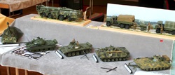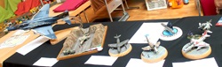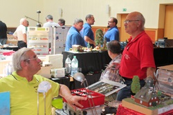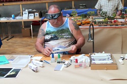 Marco hat seinen Rummelplatz weiter gebaut und, ebenfalls ein neues Vereinsmitglied, Matthias Riedel mit seiner MIG 21, hier im Gespräch mit Lutz Bauer. Im Vordergrund ist Sven Gunkel zu sehen, ihm hat es der Bau von Unterseebooten angetan.