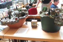 Gleich fünf kleine Eisenbahnanlagen haben die Modellbahfreunde aus Mittelschmalkalden mitgebracht. Es muss ja nicht immer die große Modellbahnanlage sein, manchmal tut es ein ausrangierter Fernseher oder ein größer Blumentopf, vielleicht aus Nachbar`s Garten, der jetzt die kleine Eisenbahn beherbergt.