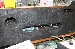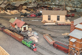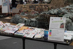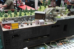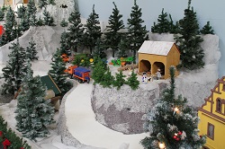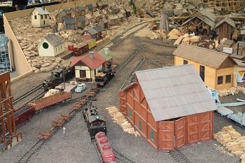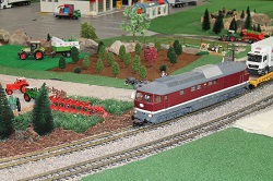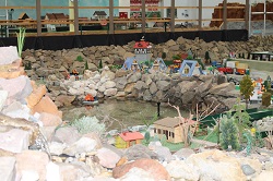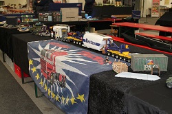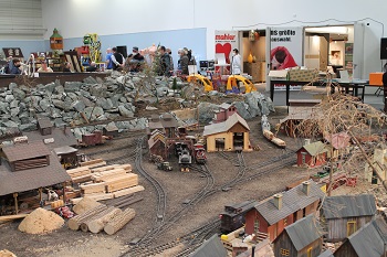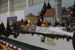 Mitten in der Ausstellung stehen zwei LGB-Bahnen, eine im Western-Stil und die andere in modernem Ambiente. Aus Neupetershain stand noch die Deko vergangener Veranstaltungen, aber das ist ja auch eine Form des Modellbaus.