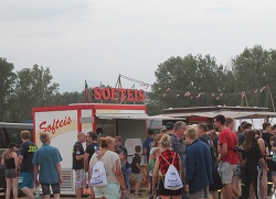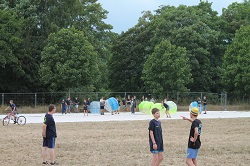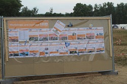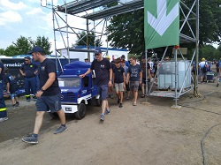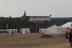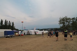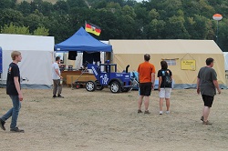 Und so haben wir uns, Bruno Brütting aus Fürth und ich am Samstag auf die Autobahn begeben und sind nach Rudolstadt gefahren. Am Meldekopf des THW angekommen, haben wir unsere Ausweise und Armbändchen bekommen. Diese haben uns als Funktioner weit sichtbar gemacht. Funktioner waren die Leute, die für den Ablauf des Zeltlagers oder des Rahmenprogramms zuständig waren. Mit uns kamen dann die 5000 Kinder und Jugendlichen aus allen Teilen Deutschlands. Während sie ihre Zelte dann selber noch aufbauen mussten, haben wir unseren Stellplatz für den Campinganhänger bezogen. Das war gar nicht so einfach, mussten doch die Autos auf einen ca. 800m entfernten Parkplatz bleiben.
