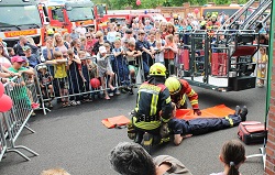 Die "großen" Feuerwehrleute haben die Rettung und Bergung eines Verletzten demonstriert. Dabei kam, trotz des beengten Einsatzortes, das Drehleiterfahrzeug zum Einsatz. Dank des Könnens der freiwilligen Feuerwehrmänner hat das sehr gut geklappt.