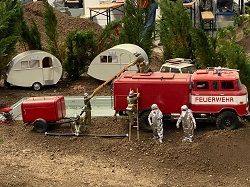 Da war die Tankstelle zusehen, die im Original in Erfurt, Nähe des Stadions steht; das Feuerwehrfahrzeug, jetzt mit den Kameraden der Feuerwehr, teilweise in ihren Gefahrenschutzanzügen und die Baustelle, auf der aus Anlass des 35. Parteitages, neue Wohnungen für die Werktätigen entstehen.