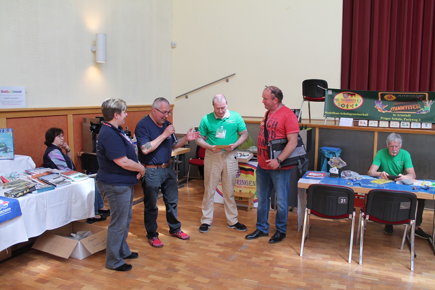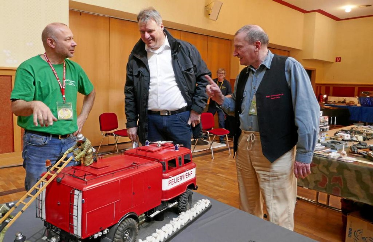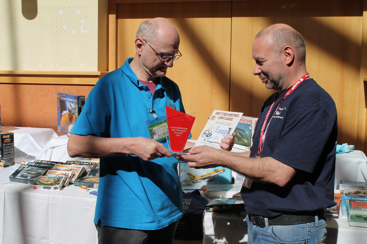 Der Plastik Modellbau Club Thüringen hatte am Samstag, dem 10. und Sonntag, dem 11. Mai 2025 zu den 23. Internationalen Modellbautagen des Vereins in die Stadthalle Arnstadt eingeladen. Zu Beginn der Ausstellung ist erneut der zweite Beigeordnete der Stadt Arnstadt, Herr Fricke gekommen. Nach ein paar Worten zur Eröffnung haben wir, Mario Rosenthal als unser neuer c/o, Herr Fricke von der Stadt Arnstadt und ich, Knut Kern als Organisator der Veranstaltung einen kurzen Rundgang gemacht. Leider stand um 11:00 Uhr die Eröffnung des Arnstädter Autofrühling an und Herr Fricke musste uns schon wieder verlassen. Diese und zwei weitere Veranstaltungen sorgten leider auch für etwas weniger Zuschauer als im vergangenen Jahr. Christian Voss aus Bittstädt hat uns wieder mit einer dicken Tasche voll mit Sponsoren und anlässlich seines Geburtstages mit reichlich Kaffee und Kuchen versorgt. Dafür gab es ein dickes Dankeschön von mir, aber auch von unserem 2.Vereinsvorsitzenden, Lutz Bauer.