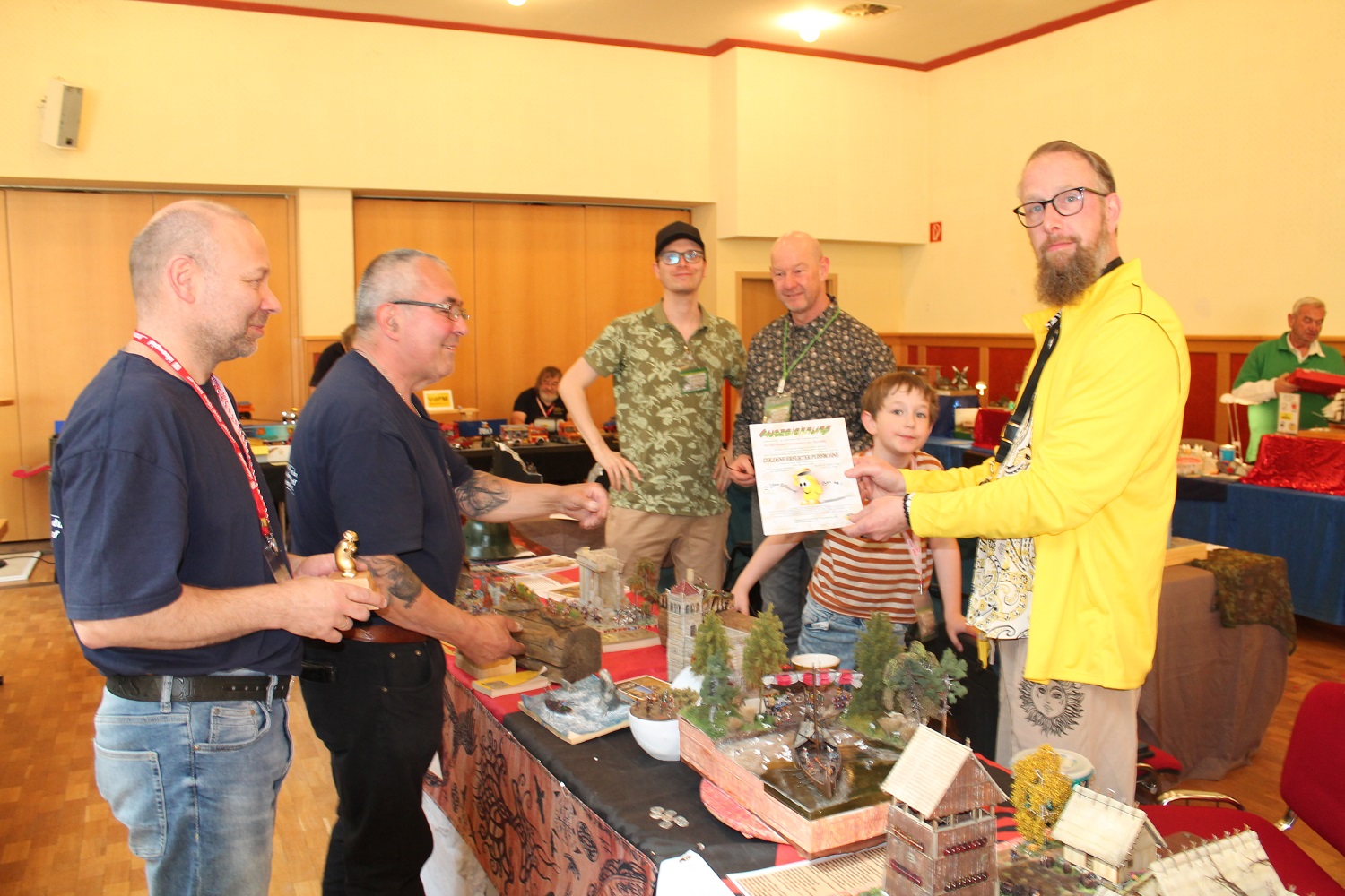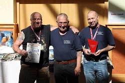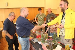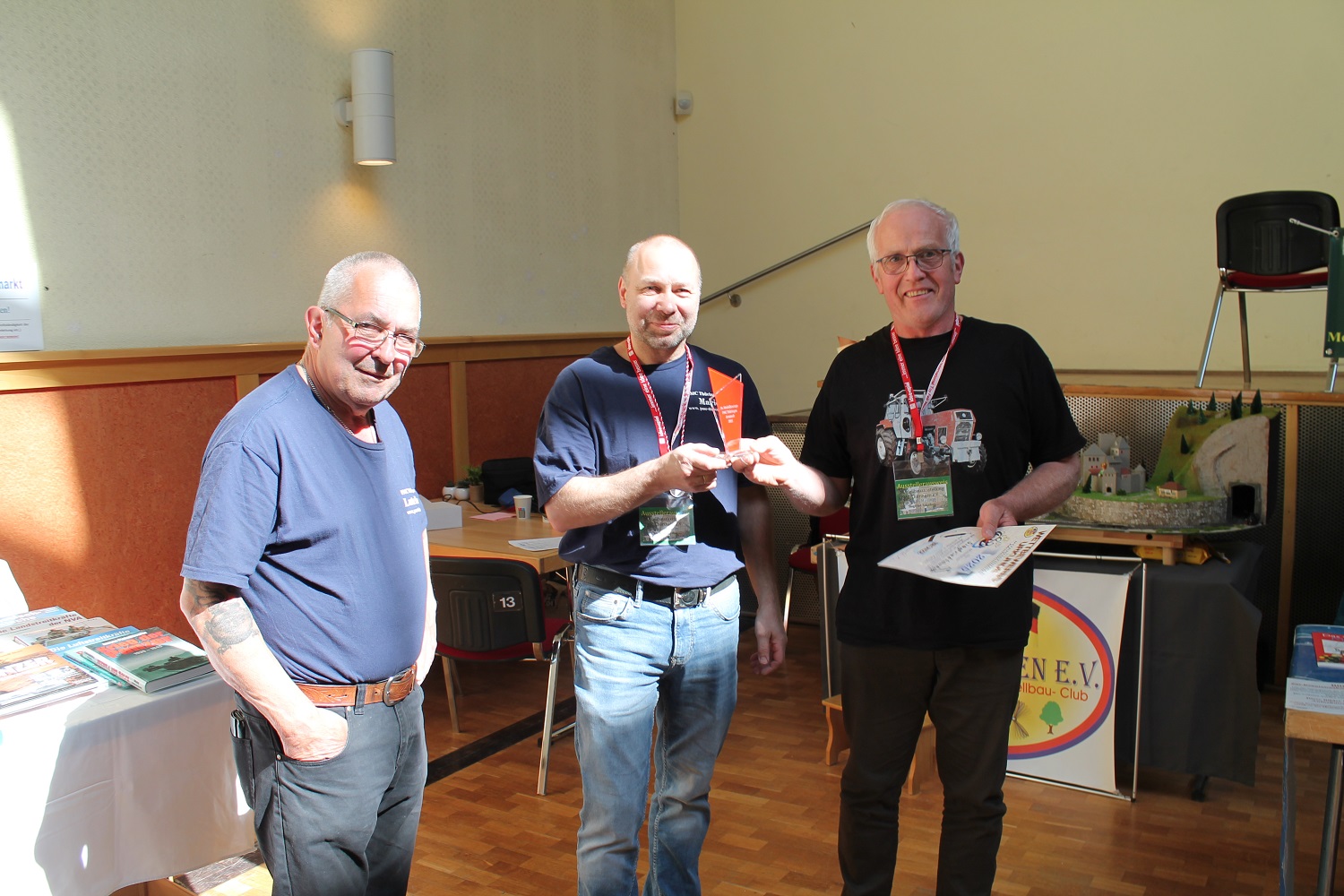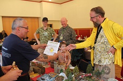 Bei der Ausstellung des PMC Thüringen ist es üblich, für schöne Modelle am Stand und für eine schöne Präsentation dieser, die goldene Puffbohne zu überreichen. In diesem Jahr hat sich der Vorstand vom PMC Thüringen recht eindeutig für Harald Ritter und seinen Begleitern, Jens und Johannes aus Bautzen entschieden. Dies war dann auch gleich die erste Amtshandlung von unserem neuen Vereinsvorsitzenden, Mario Rosenthal aus Ilmenau. Er hat seit der Mitgliederversammlung am Samstag Abend dieses Amt nach einstimmiger Wahl übernommen. Glückwunsch an Harald, Jens und Johannes und natürlich auch an Mario. Und dann ist es, glaube ich genauso einmalig, das der Zuschauer bei unserem Zuschauerwettbewerb das schönste Modell auswählen kann. Dazu hat jeder Besucher auf der Rückseite seiner Eintrittkarte vier Felder, wo er die Nummer seines Favoriten eintragen kann. In diesem Jahr hatten Vater und Sohn Schadeck, Dr. Jürgen Willisch und als erster Preisträger, Fredi Lüthi aus der Schweiz mit seinem Australien-Diorama die meisten Punkte bei der Auszählung. Herzlichen Glückwunsch dazu.