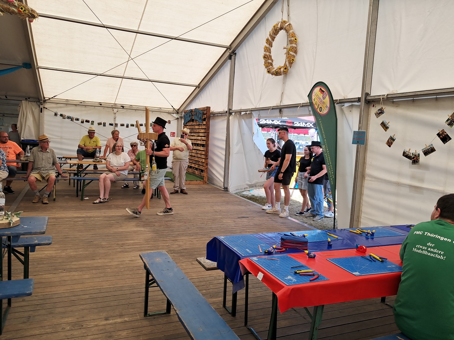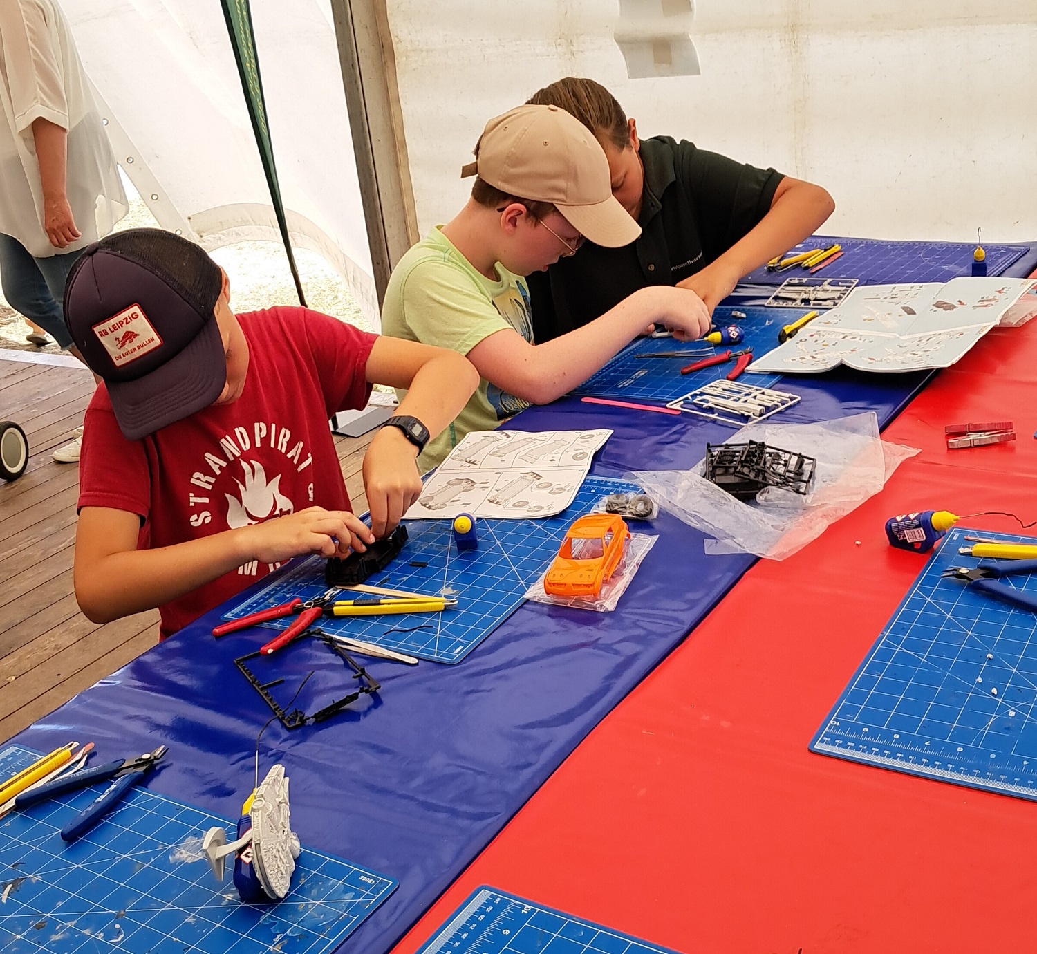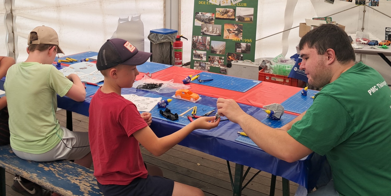 W#hrend ich ja im vergangenen Jahr noch der Meinung war; wer schickt den sein Kind schon zum Frühshoppen der Kirmes, wurde wahrscheinlich reichlich über unsere Bastelstrasse in der Gemeinde gesprochen und ebenso viel Mundpropaganda gemacht. Denn auch wenn es auf den Bildern nicht so rüberkommt, ich hatte keine Zeit, um ein paar Bilder vom Ansturm auf unsere Bastelplätze zumachen. Max, unser neuer Bastelkollege in der Modellbau-AG war ja auch mitgekommen und hat auch mitgeholfen, den Kindern aufzuzeigen, wie Modellbau geht.