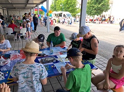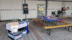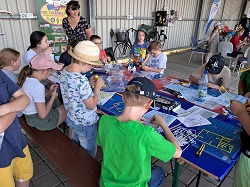 Los ging`s wieder um 13:30 Uhr. Ich war schon gegen 12:00 Uhr da und habe aus dem vorigen Jahr gelernt und diesmal sogar 8 Bastelplätze für die Kinder eingerichtet. Aber was soll ich sagen, es hat auch diesmal nicht gereicht. Der Andrang an meinen Tischen war so enorm, leider musste ich wieder einige Kinder vertrösten und zum Warten auffordern. Benni Kunz aus Gossel hat mir wieder geholfen und die Bilder waren in dieser Beziehung kein Einzelfall. Es wurde wieder gebastelt und gebaut, was das Zeug hielt bzw. die Kiste mit den Bausätzen hergab. Trotzdem hat es allen, auch mir gefallen und sehr viel Spass gemacht.