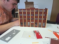 Da es sich um ein Gebäudekomplex des damaligen industriellen Zeitalters handelt, können wir dazu das BKS (Baukastensystem) von der Firma Auhagen benutzen. Zunächst haben wir die Planungshilfe von der Homepage der Firma Auhagen genutzt und uns mal an die Planung der vorderen Seite der Brauerei gesetzt. Nach der so entstandenen Vorlage aus Papier, mit Schere und Papierkleber habe ich bei Auhagen die benötigten Teile bestellt, die wir nun gemeinsam in unserer Modellbau-AG zusammen gebaut haben. Während wir uns bei der roten Farbe sehr schnell auf das Ziegelrot von Revell geeinigt haben, gab es beim Gelb-Beige-Gemisch einige Diskussionen, bis wir uns schließlich auf einen Farbton von Valejo geeinigt haben. Von Faller stammen die beiden Sudkessel, die wir mit Kupfer und glänzendem Lack von Revell dem Kupferglanz der Behälter in einer Brauerei angepasst haben. Und dann ging es schon mit der Planungshilfe für die nächste Seite der Brauerei weiter.