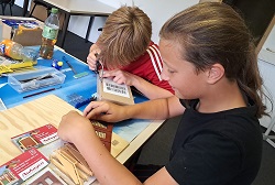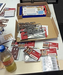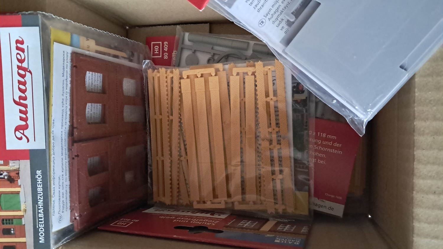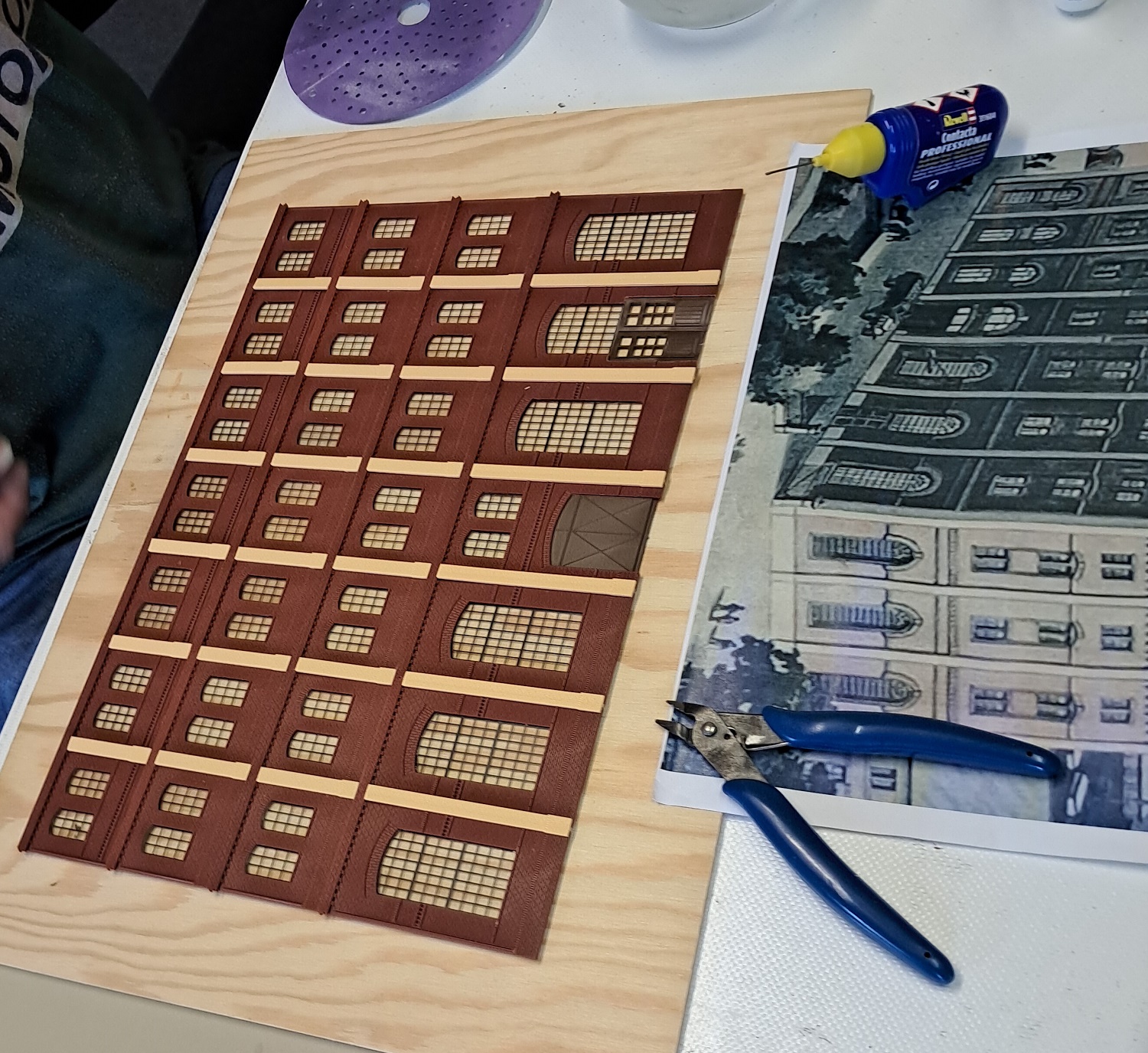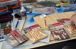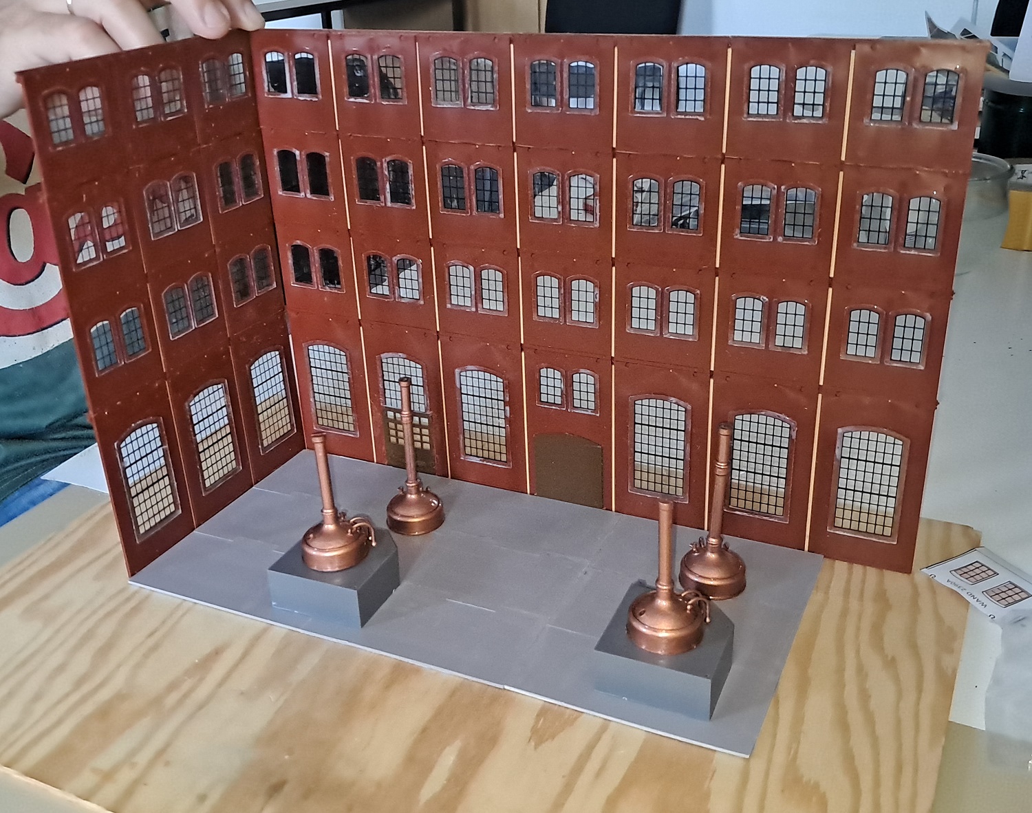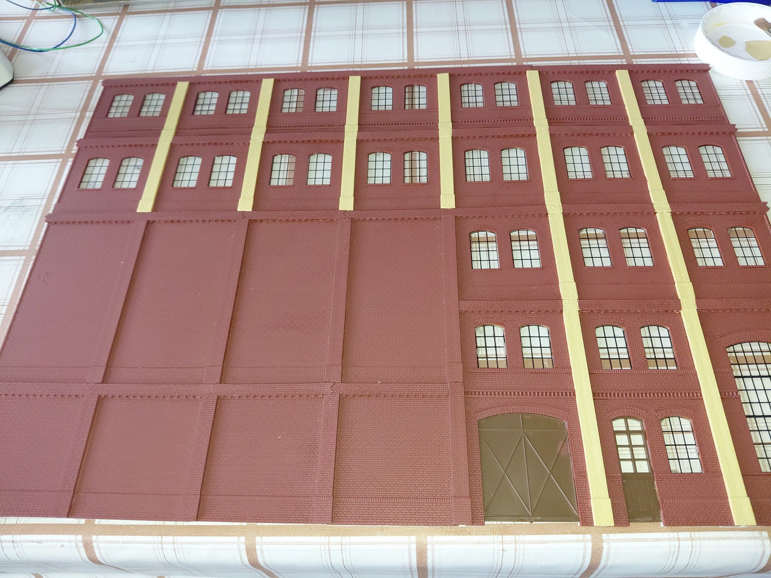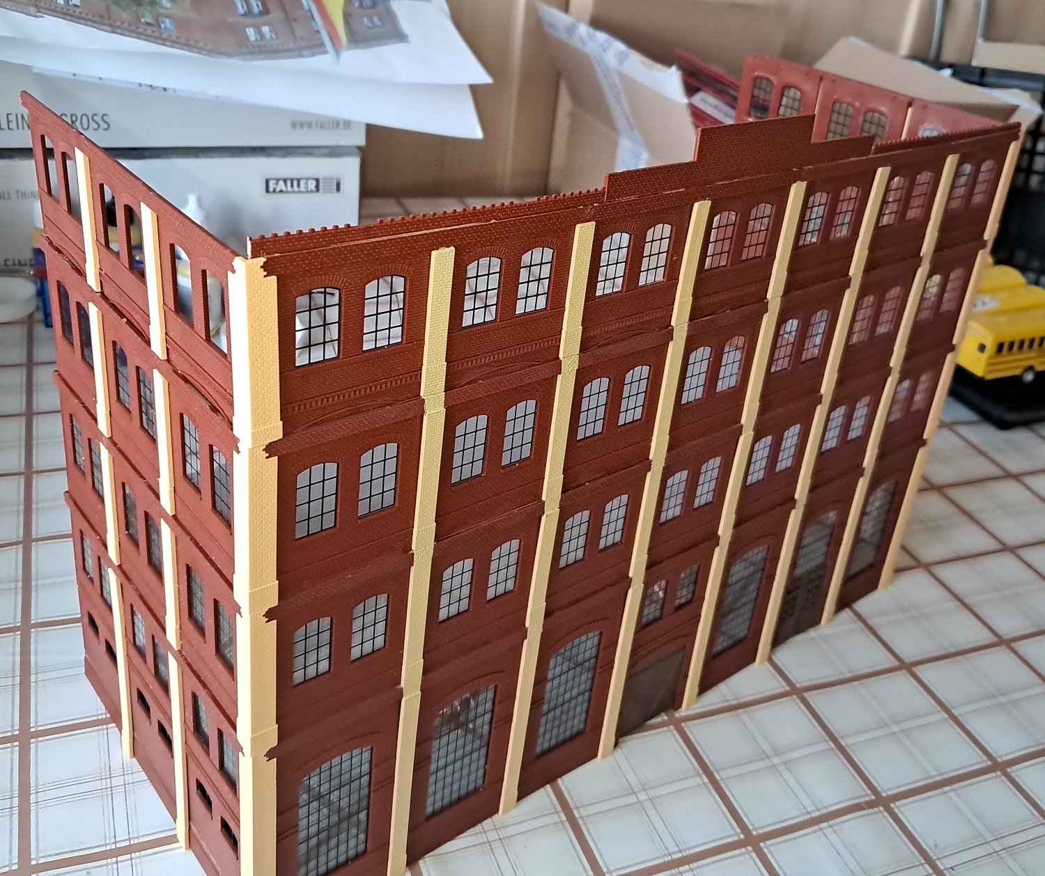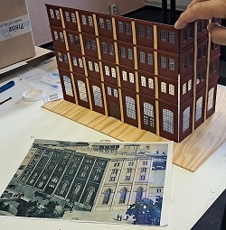 Da es sich um ein Gebäudekomplex des damaligen industriellen Zeitalters handelt, können wir dazu das BKS (Baukastensystem) von der Firma Auhagen benutzen. Zunächst haben wir die Planungshilfe von der Homepage der Firma Auhagen genutzt und uns mal an die Planung der vorderen Seite der Brauerei gesetzt. Nach der so entstandenen Vorlage aus Papier, mit Schere und Papierkleber habe ich bei Auhagen die benötigten Teile bestellt, die wir nun gemeinsam in unserer Modellbau-AG zusammen gebaut haben. Während wir uns bei der roten Farbe sehr schnell auf das Ziegelrot von Revell geeinigt haben, gab es beim Gelb-Beige-Gemisch einige Diskussionen, bis wir uns schließlich auf einen Farbton von Valejo geeinigt haben. Von Faller stammen die beiden Sudkessel, die wir mit Kupfer und glänzendem Lack von Revell dem Kupferglanz der Behälter in einer Brauerei angepasst haben. Und dann ging es schon mit der Planungshilfe für die nächste Seite der Brauerei weiter.