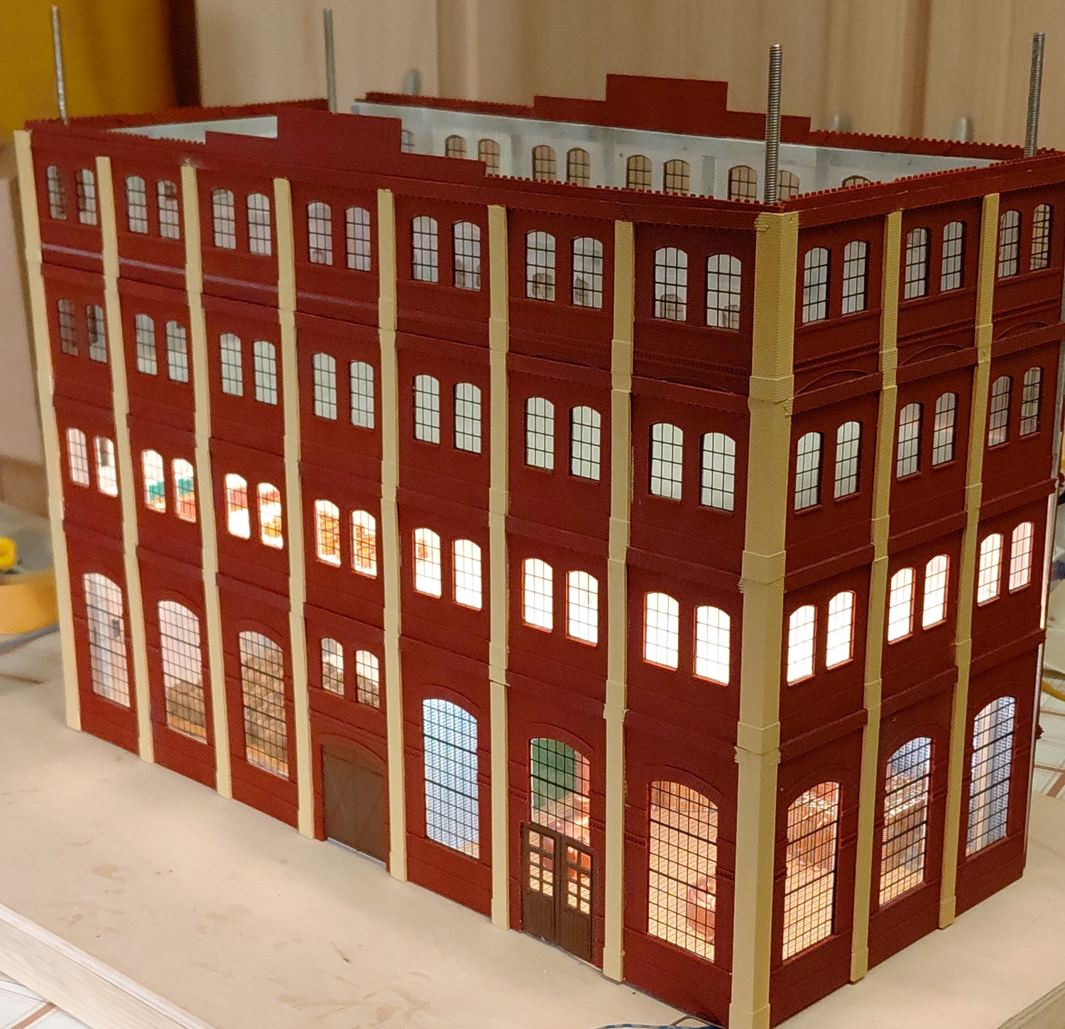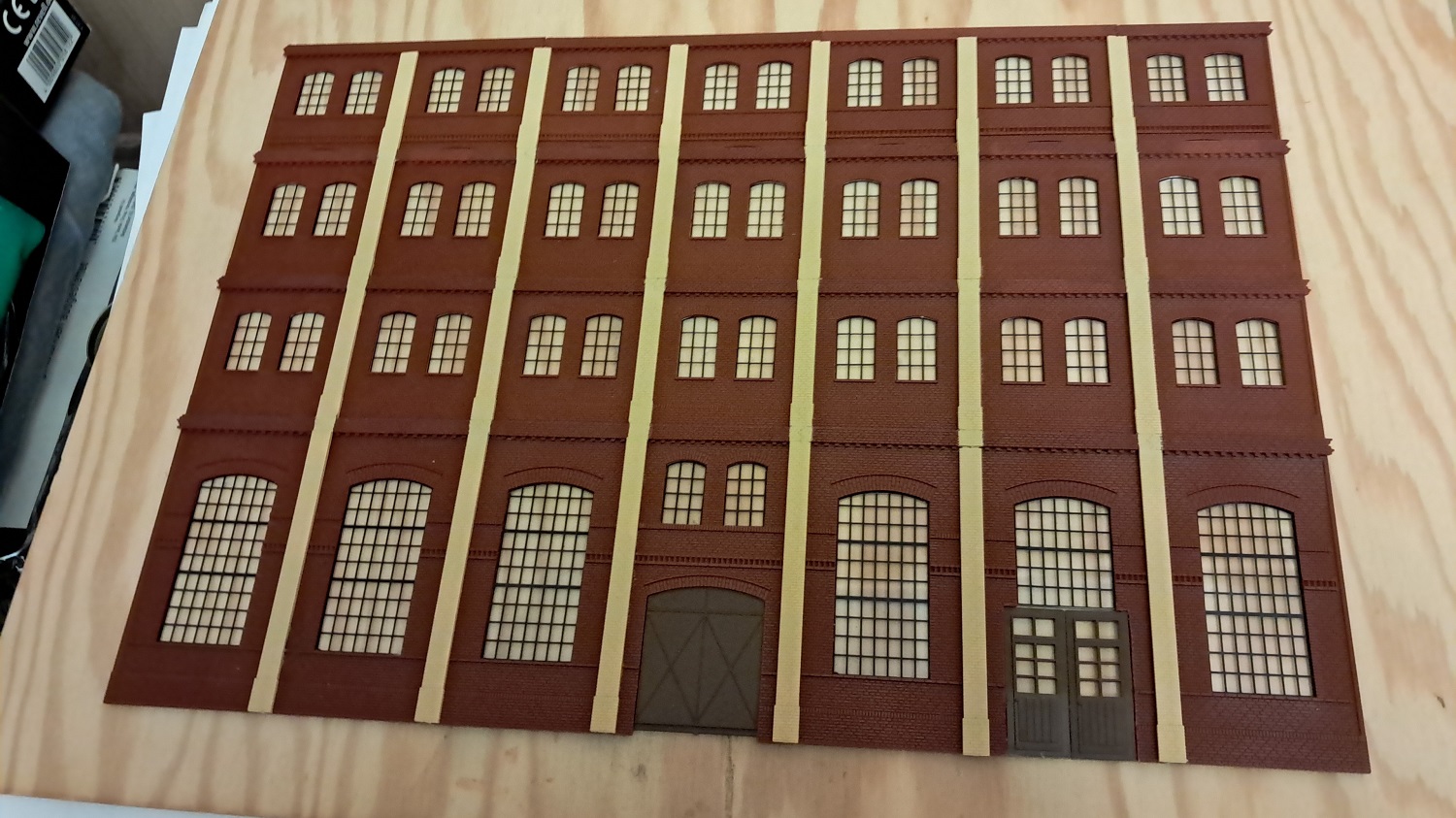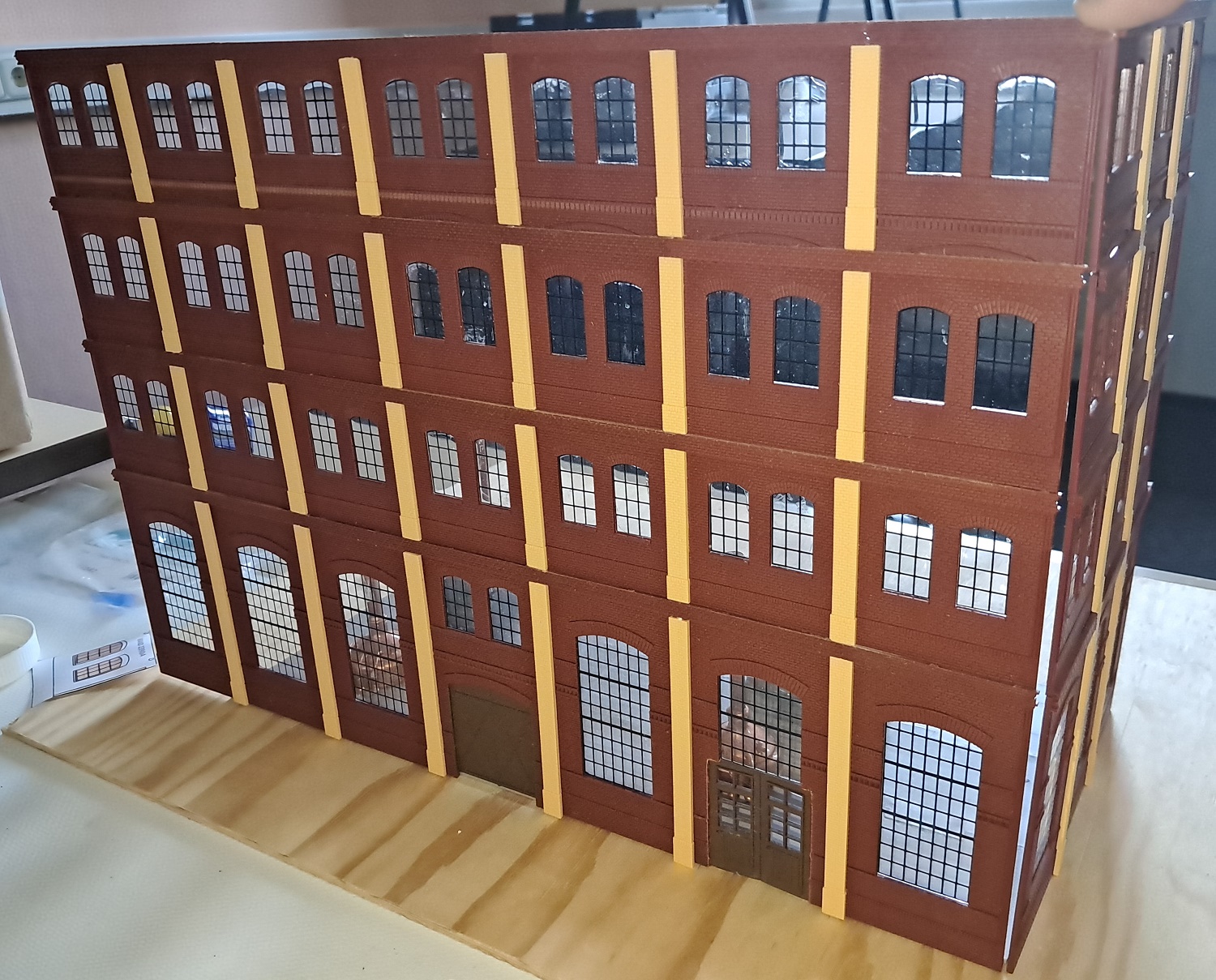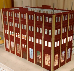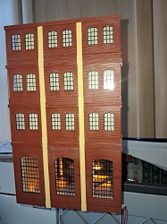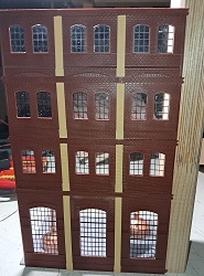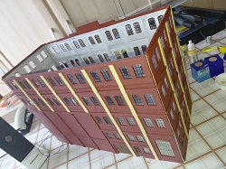 Die nächste Lieferung von Auhagen ist angekommen und weiter geht es mit der Brauerei zu Arnstadt. Hier ist mal ein Foto der fertig bemalten breiten Seite des Brauereigebäudes. Im Gegensatz zum heutigen Erscheinungsbild sind auf dem Bild oben die Säulen zwischen den Fenstern in gelb, was uns beim Bau sehr entgegen gekommen ist. Mario sägt mit seiner Kreissäge gerade den Boden und die Zwischenetagen auf ihre richtige Größe, während Benni mit dem Anbau der hinteren Seite der Brauerei beschäftigt ist. Ein bisschen Inneneinrichtung und nachdem wir uns bei unserem Besuch in der Brauerei in Watzdorf mal ein Bild vom Betriebsablauf des Bierbrauens machen konnten, haben wir uns entschlossen, den Raum mit den Sudkesseln mit einer Zwischenwand abzutrennen. Dort habe ich jetzt gelbes Licht eingebaut. Während die Anderen mit dem Innenausbau des Brauerei-Gebäudes beschäftigt waren, haben Anton und ich die Rückseite des Gebäudes gefertigt. Hierzu gibt es keine Vorlage, also glauben wir, dass es so ausgesehen haben könnte. Links kommt dann der Anbau dran, wo sich heute der Eingang und die Rezeption des Hotelpark Stadtbrauerei Arnstadt befindet. Auf dem Bild zur Stellprobe mit der fertigen Rückseite sieht man auch die Arbeit meiner Bastelfreunde in unserer AG. Da man durch die großzügigen Fenster und dem Licht sehr gut in das Gebäude schauen kann, haben wir die Innenseite der Wände mit dem Karton von Auhagen, der die verputzt Innenseite der Fabrikhallen bzw. unserer Brauerei darstellt, ausgekleidet. Um die Höhenunterschiede durch die Türen und Fenster auszugleichen, wurden zunächst Pappstreifen zurecht geschnitten und eingeklebt. Darauf wurde dann der Karton mit dem "Putz" aufgeklebt. Nachdem im Sudhaus bereits Licht ist, habe ich im anderen Teil der Etage ebenfalls, allerdings getrennt schaltbares Licht eingebaut und im ersten Geschoss über die gesamte Fläche ebenfalls. Mit dem Einbau der Treppe, die bei Auhagen allerdings als Aussentreppe verkauft wird, sind somit das Erdgeschoss und die erste Etage unserer Brauerei fertig. Diesen Blick in das Innere der Brauerei wird es, wenn die Rückwand anbaut wird, nicht mehr geben. Eigentlich ein bisschen schade, sieht man doch hier, wieviel Arbeit im Innenausbau der beiden unteren Etagen steckt.