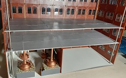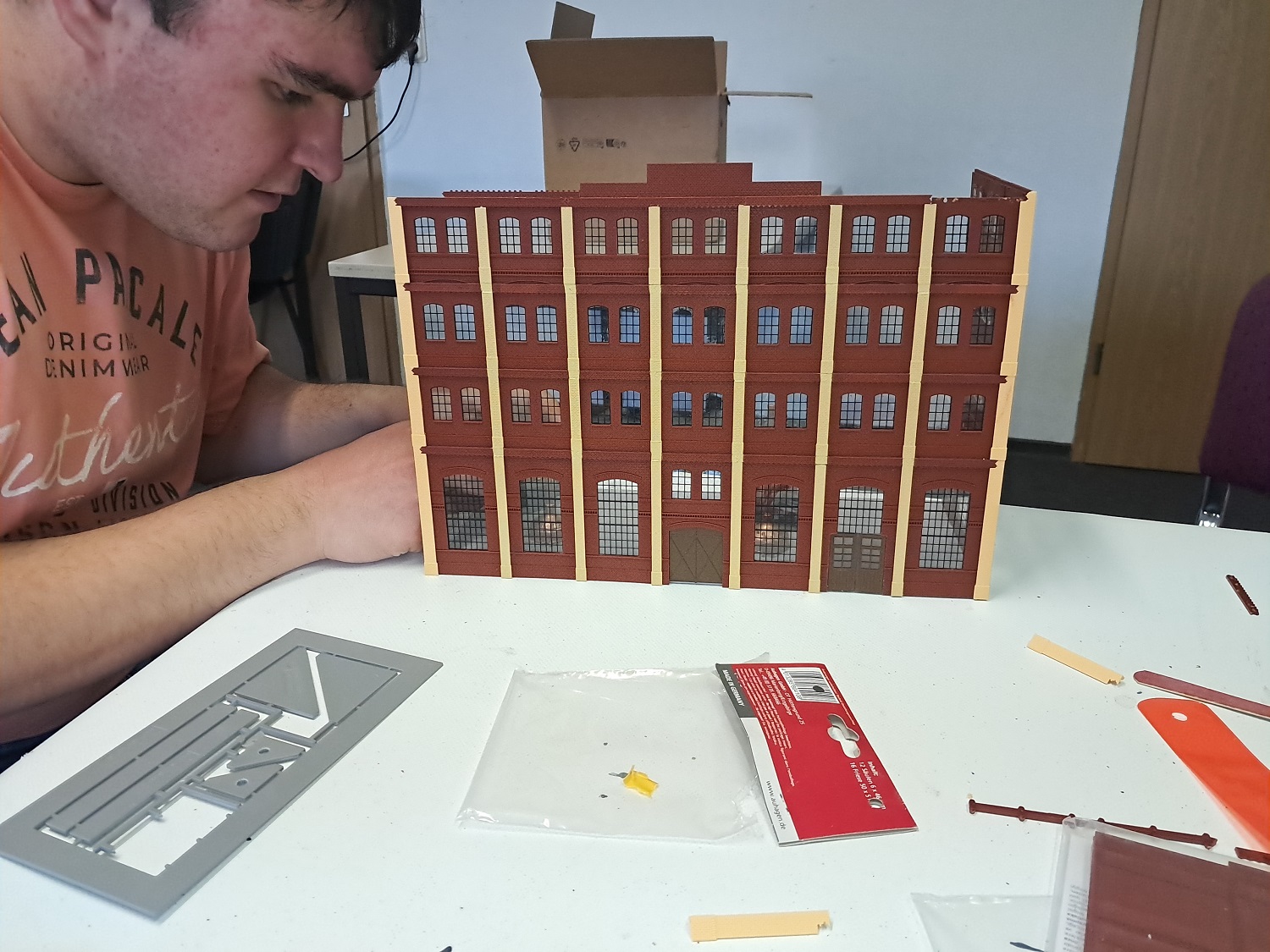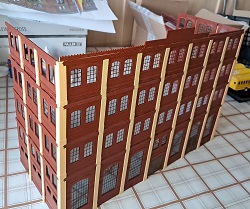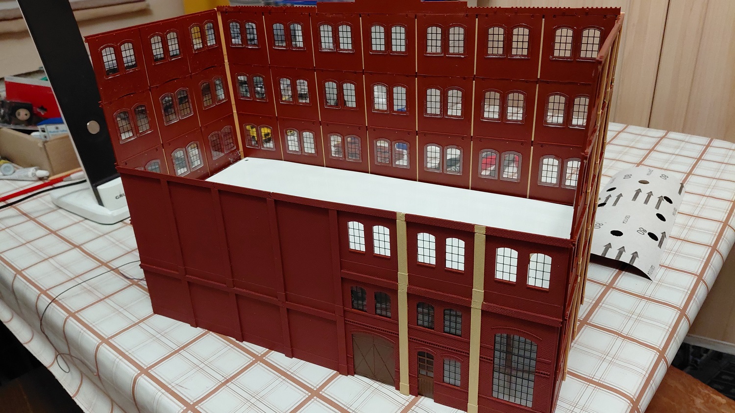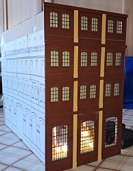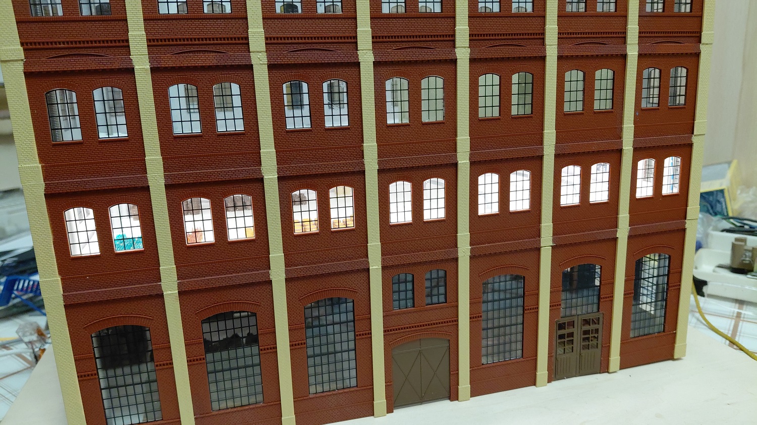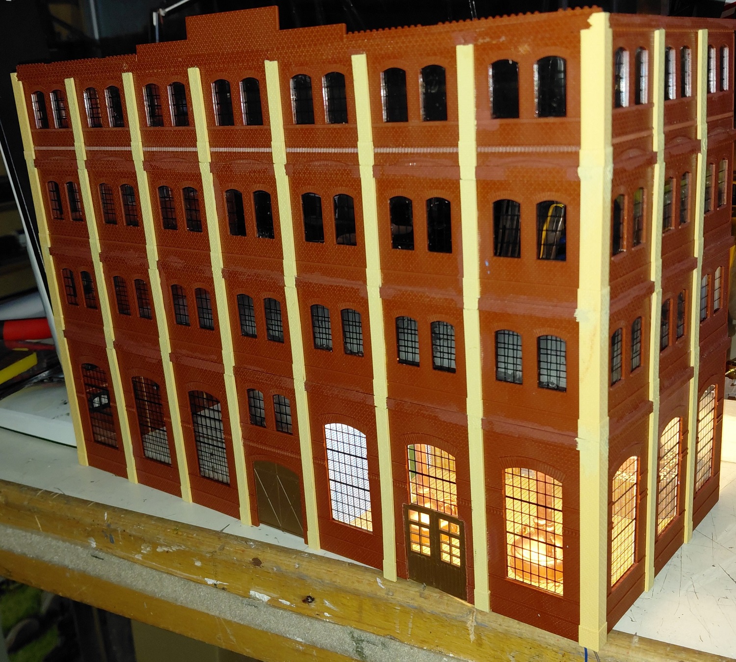 Die nächste Lieferung von Auhagen ist angekommen und weiter geht es mit der Brauerei zu Arnstadt. Hier ist mal ein Foto der fertig bemalten breiten Seite des Brauereigebäudes. Im Gegensatz zum heutigen Erscheinungsbild sind auf dem Bild oben die Säulen zwischen den Fenstern in gelb, was uns beim Bau sehr entgegen gekommen ist. Mario sägt mit seiner Kreissäge gerade den Boden und die Zwischenetagen auf ihre richtige Größe, während Benni mit dem Anbau der hinteren Seite der Brauerei beschäftigt ist. Ein bisschen Inneneinrichtung und nachdem wir uns bei unserem Besuch in der Brauerei in Watzdorf mal ein Bild vom Betriebsablauf des Bierbrauens machen konnten, haben wir uns entschlossen, den Raum mit den Sudkesseln mit einer Zwischenwand abzutrennen. Dort habe ich jetzt gelbes Licht eingebaut. Während die Anderen mit dem Innenausbau des Brauerei-Gebäudes beschäftigt waren, haben Anton und ich die Rückseite des Gebäudes gefertigt. Hierzu gibt es keine Vorlage, also glauben wir, dass es so ausgesehen haben könnte. Links kommt dann der Anbau dran, wo sich heute der Eingang und die Rezeption des Hotelpark Stadtbrauerei Arnstadt befindet. Auf dem Bild zur Stellprobe mit der fertigen Rückseite sieht man auch die Arbeit meiner Bastelfreunde in unserer AG. Da man durch die großzügigen Fenster und dem Licht sehr gut in das Gebäude schauen kann, haben wir die Innenseite der Wände mit dem Karton von Auhagen, der die verputzt Innenseite der Fabrikhallen bzw. unserer Brauerei darstellt, ausgekleidet. Um die Höhenunterschiede durch die Türen und Fenster auszugleichen, wurden zunächst Pappstreifen zurecht geschnitten und eingeklebt. Darauf wurde dann der Karton mit dem "Putz" aufgeklebt. Nachdem im Sudhaus bereits Licht ist, habe ich im anderen Teil der Etage ebenfalls, allerdings getrennt schaltbares Licht eingebaut und im ersten Geschoss über die gesamte Fläche ebenfalls. Mit dem Einbau der Treppe, die bei Auhagen allerdings als Aussentreppe verkauft wird, sind somit das Erdgeschoss und die erste Etage unserer Brauerei fertig. Diesen Blick in das Innere der Brauerei wird es, wenn die Rückwand anbaut wird, nicht mehr geben. Eigentlich ein bisschen schade, sieht man doch hier, wieviel Arbeit im Innenausbau der beiden unteren Etagen steckt.