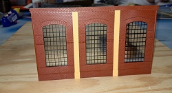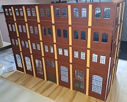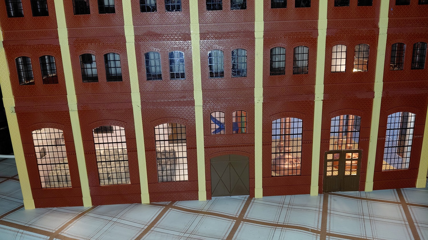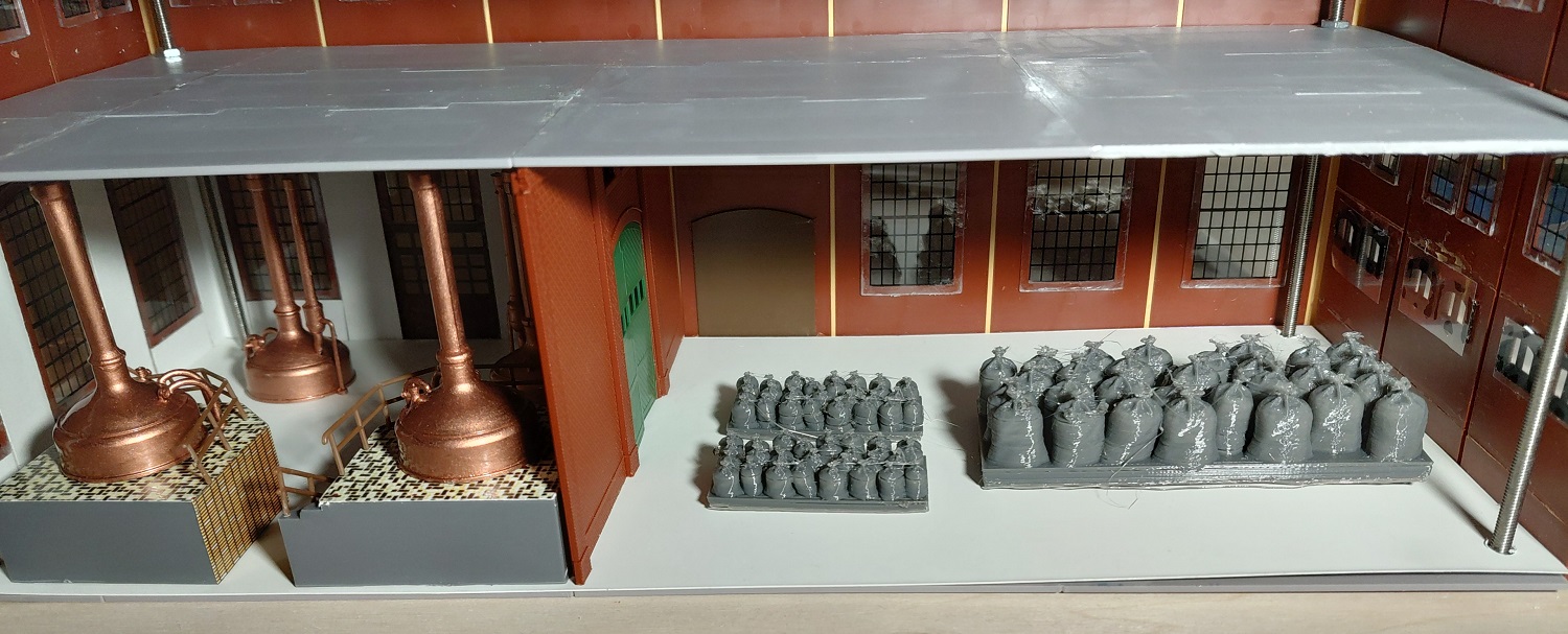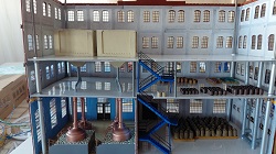 Die "lange" Seite der Brauerei besteht aus sieben Segmenten. Dafür haben wir unten Wände mit den Industriefenster E, darüber jeweils zweimal die Wände mit den Fenstern A und oben die Wänd mit den Fenstern B zusammengebaut. Unten in der Mitte haben wir noch das Tor G eingesetzt und links davon die Doppeltür S, die auf dem Originalbild zu sehen ist. Diese gibt es aber nach dem Umbau zum Hotelpark nicht mehr. Ja, und dann gab es schon mal eine erste Stellprobe, wo wir noch die Sudbehälter dazu gestellt haben, verbunden mit einem Blick in das Innere des Brauereigebäudes.
