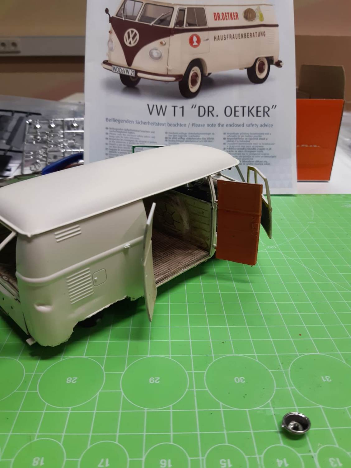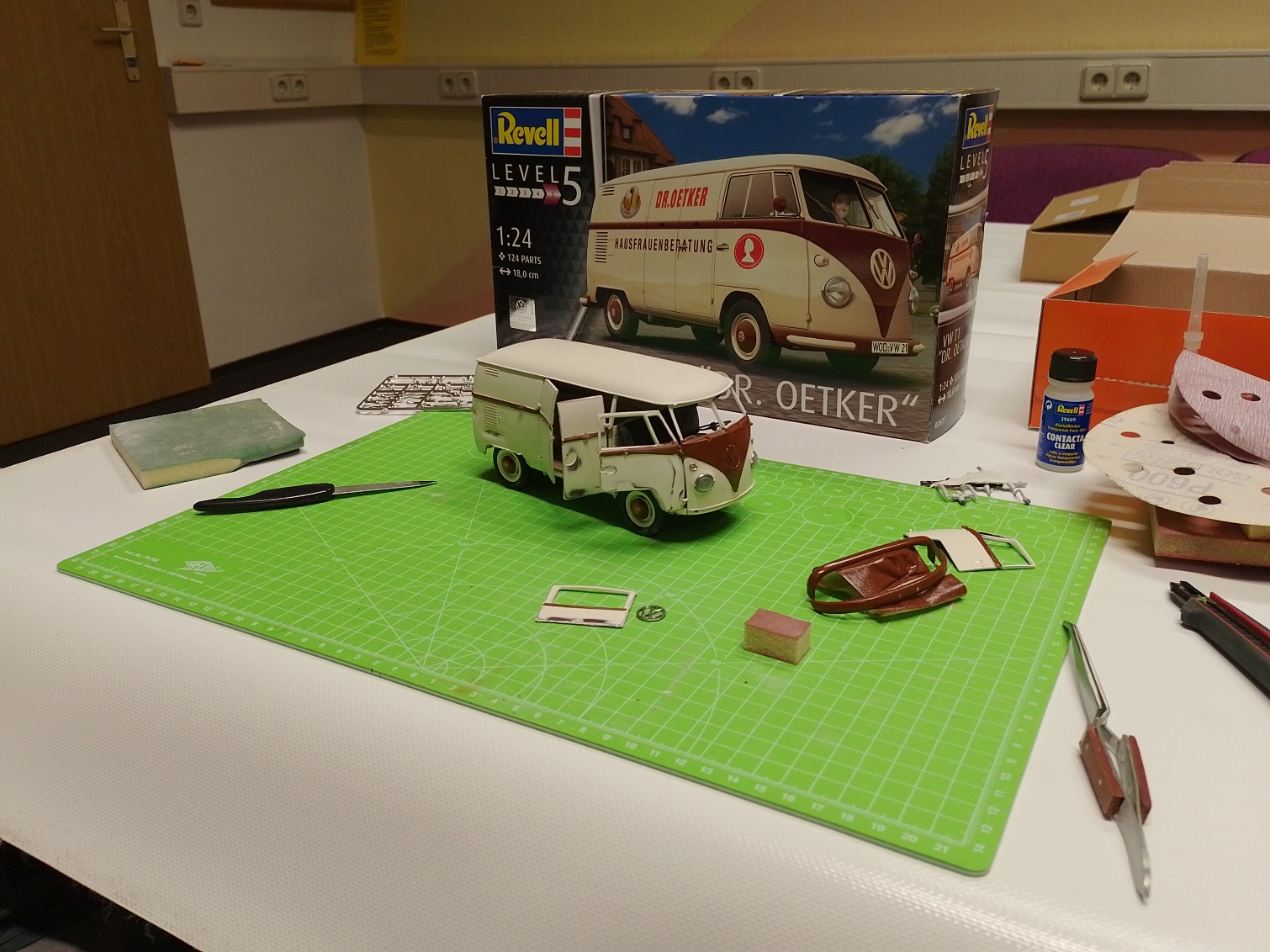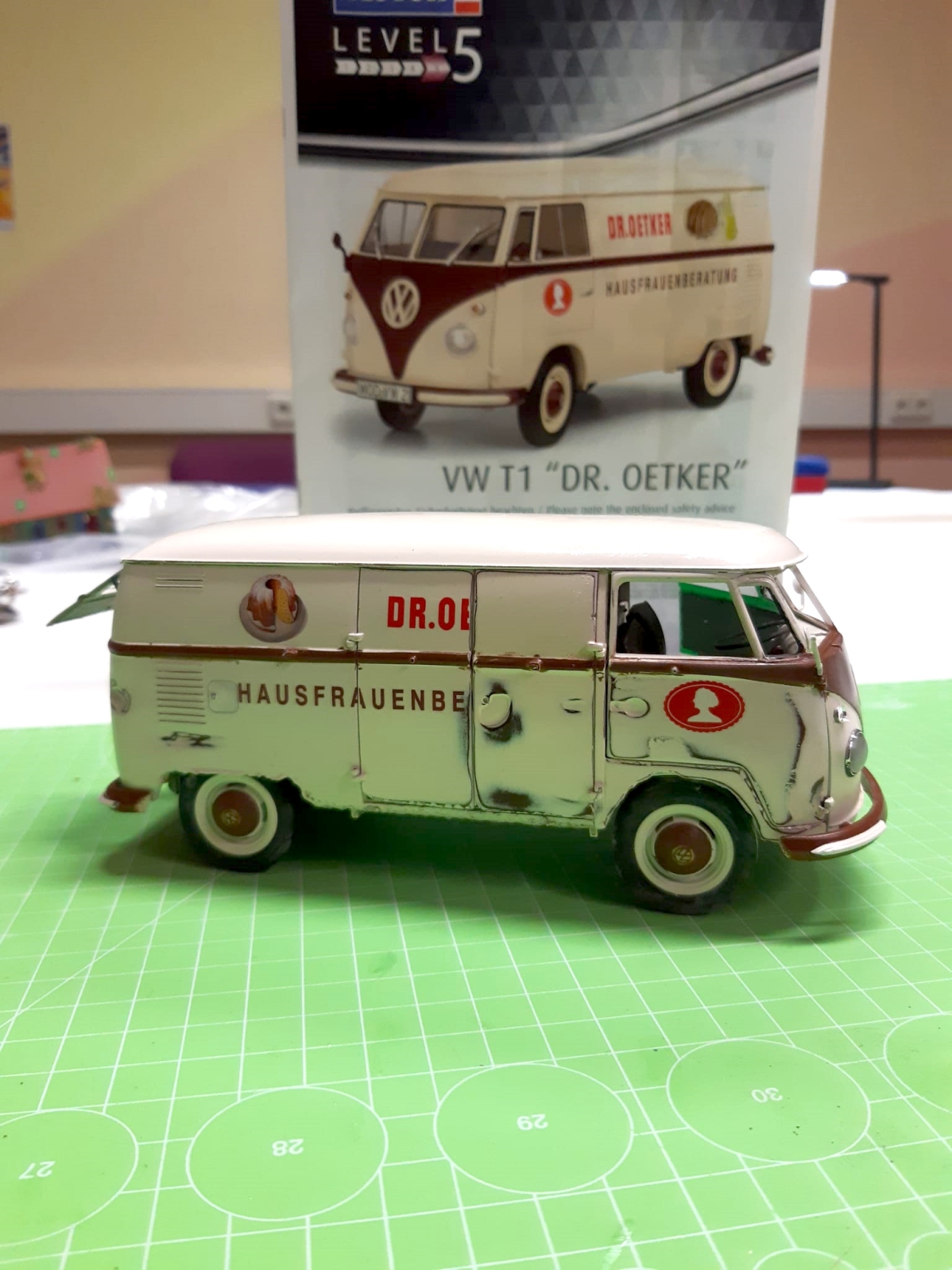Dieser VW-Bus T1 ist im Modell etwas in die Jahre gekommen. Dieser VW T1 Marken-Werbebulli ist bei Revell unter der Bestell-Nr.: 67677 zu bekommen. Originalfarben sind im Set mit dabei. In unserer AG wurde auf die Farben weitgehendst verzichtet und das Fahrzeug gealtert. Es entstand ein sehr realistisches Modell, welches sicherlich hier und da noch im Hinterhof rumstehen dürfte.