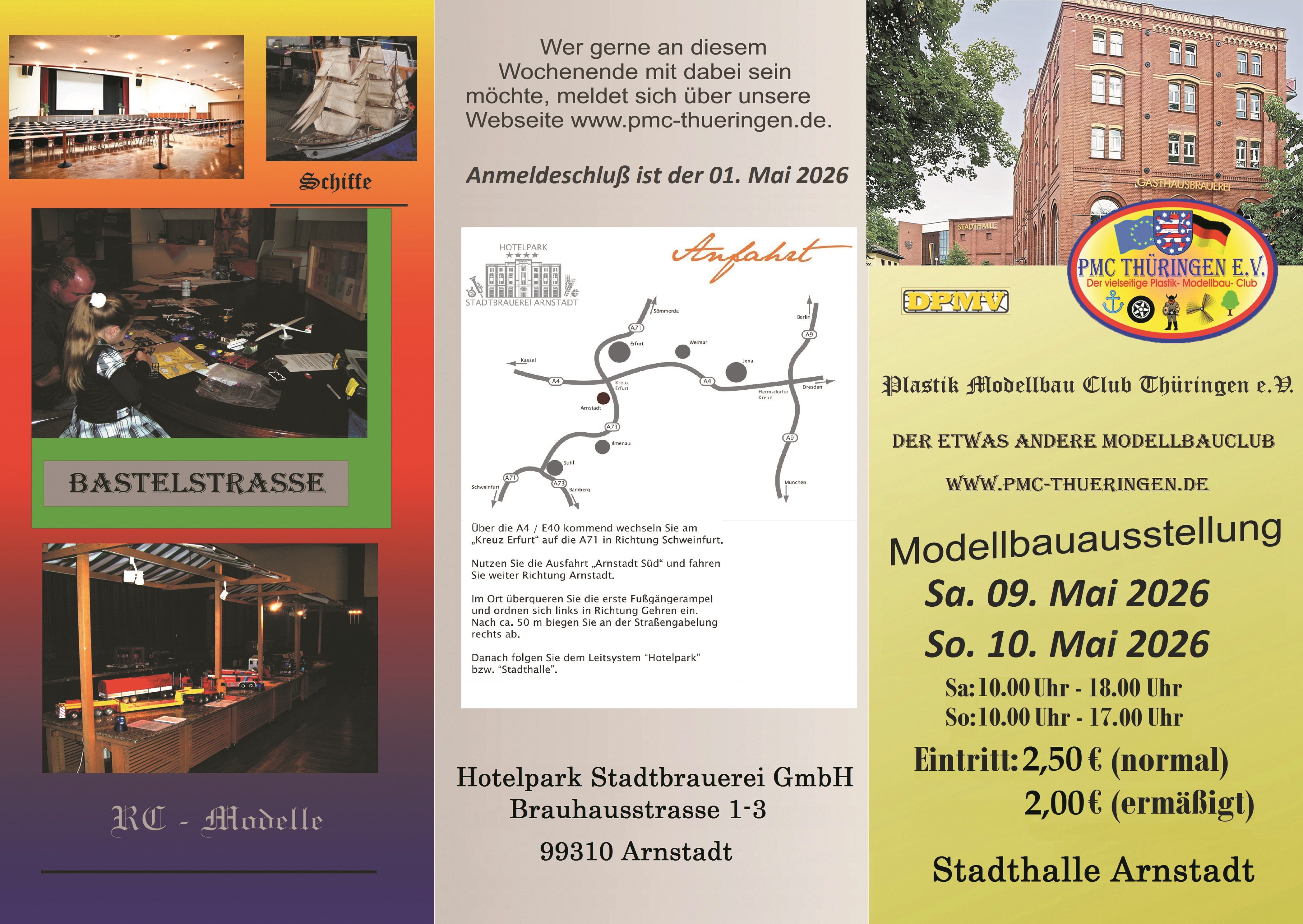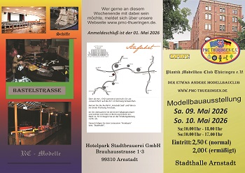 Der PMC Thüringen e.V. führt wieder die inzwischen 26. Internationalen Modellbautage des Vereins durch. Diese Veranstaltung findet nun schon zum 10. Mal in der Stadthalle Arnstadt im Hotelpark Stadtbrauerei Arnstadt, Brauhausstrasse 1-3 statt.